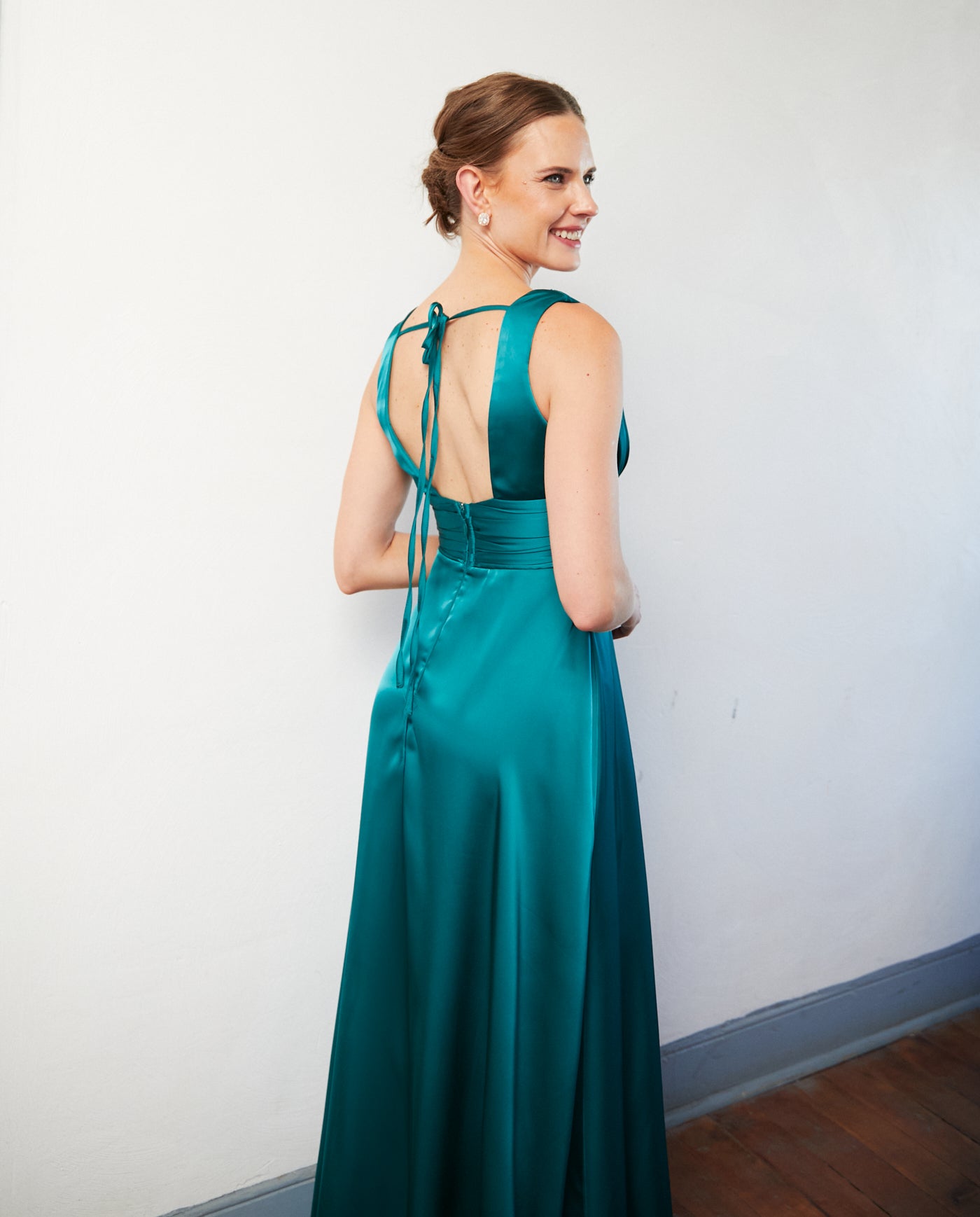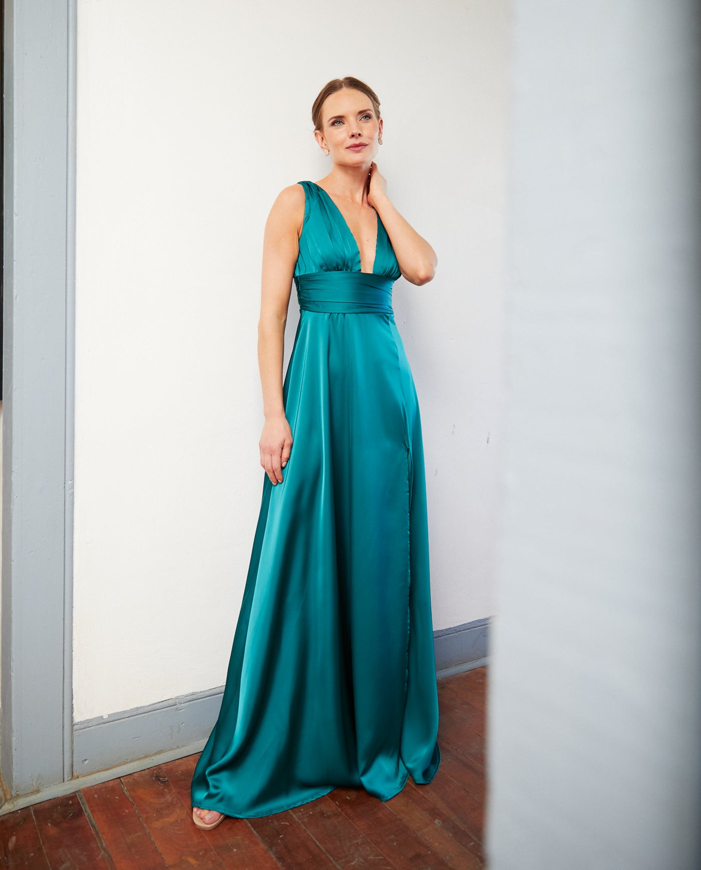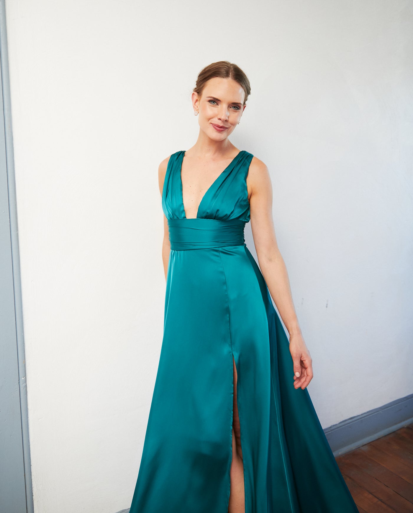 Vestido Largo de Fiesta Isabel Verde Petroleo confeccionado en Satín, con ABERTURA LATERAL que realzan la silueta de forma elegante. Su diseño de líneas limpias y caída fluida ofrece un look femenino y sofisticado, ideal para Invitada matrimonio de noche, Graduación, Fiesta gala. Este vestido es parte de nuestra Colección EE.UU.