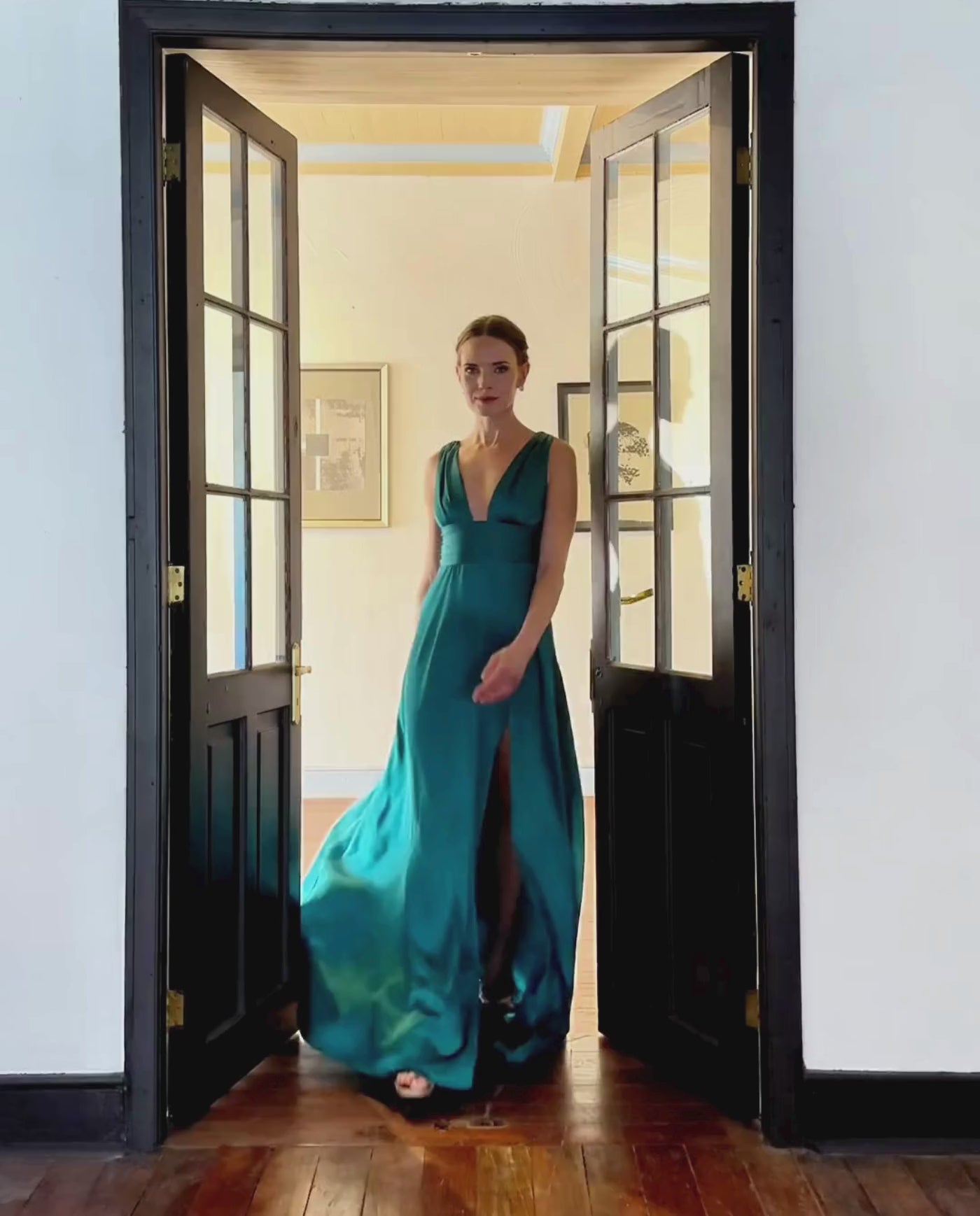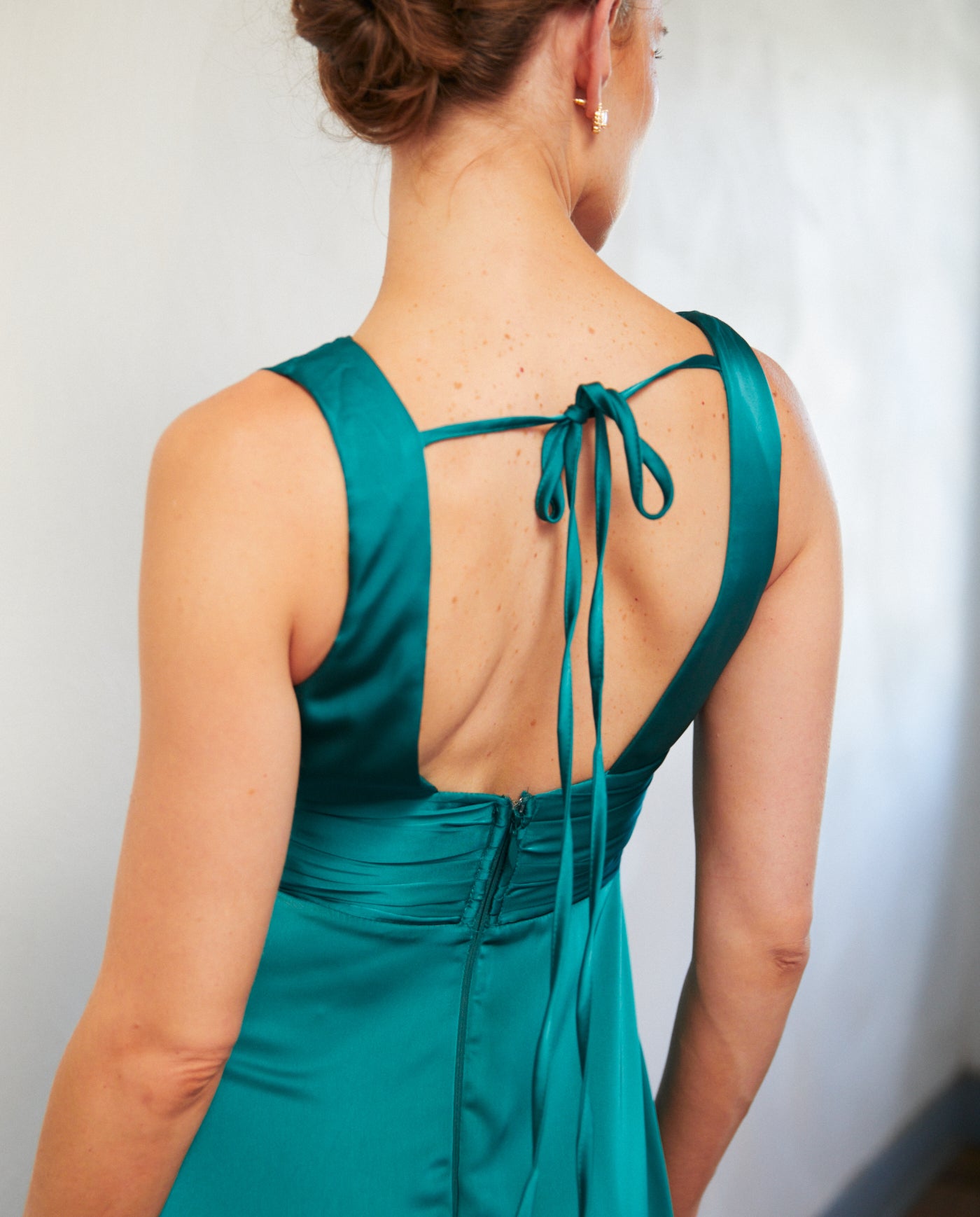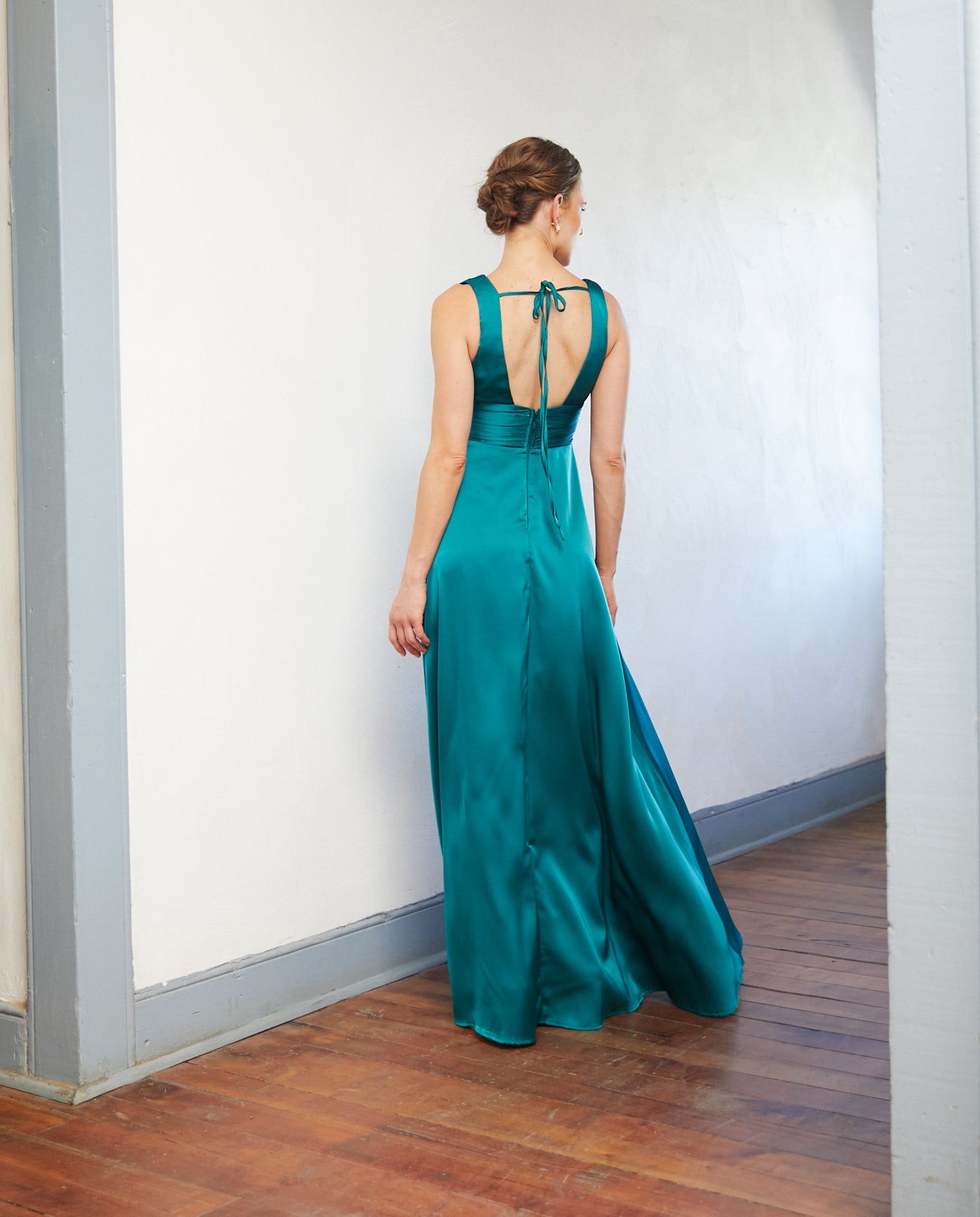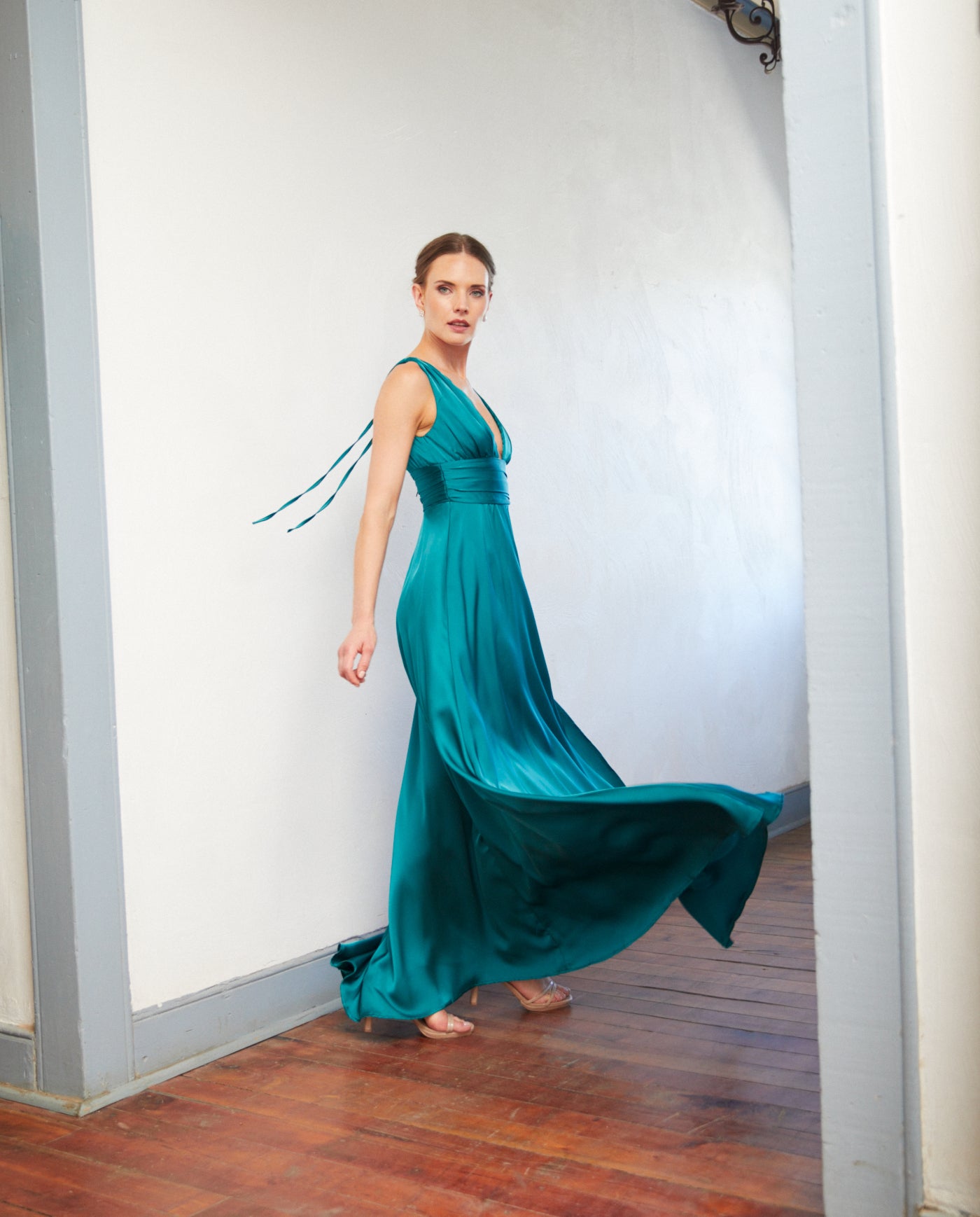 Vestido Largo de Fiesta Isabel Verde Petroleo confeccionado en Satín, con ABERTURA LATERAL que realzan la silueta de forma elegante. Su diseño de líneas limpias y caída fluida ofrece un look femenino y sofisticado, ideal para Invitada matrimonio de noche, Graduación, Fiesta gala. Este vestido es parte de nuestra Colección EE.UU.