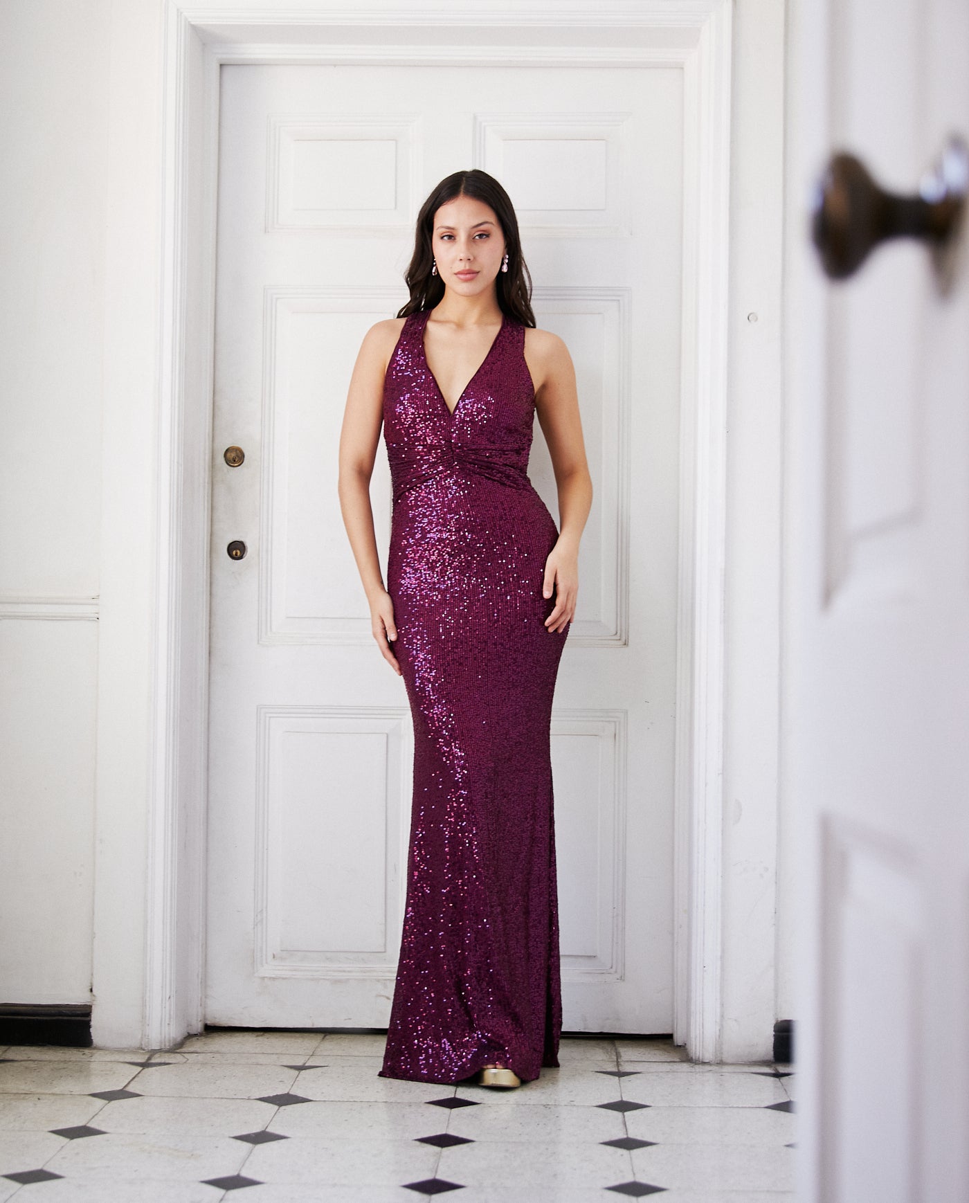 Nuestro Vestido Amara Morado, esta confeccionado en tela de lentejuelas elasticadas que se ajusta perfectamente al cuerpo. Su espalda rebajada y escote en V realzan la figura y aportan brillo en cada movimiento. Ideal para fiestas de gala y matrimonios de noche. Pertenece a nuestra Colección EE.UU.