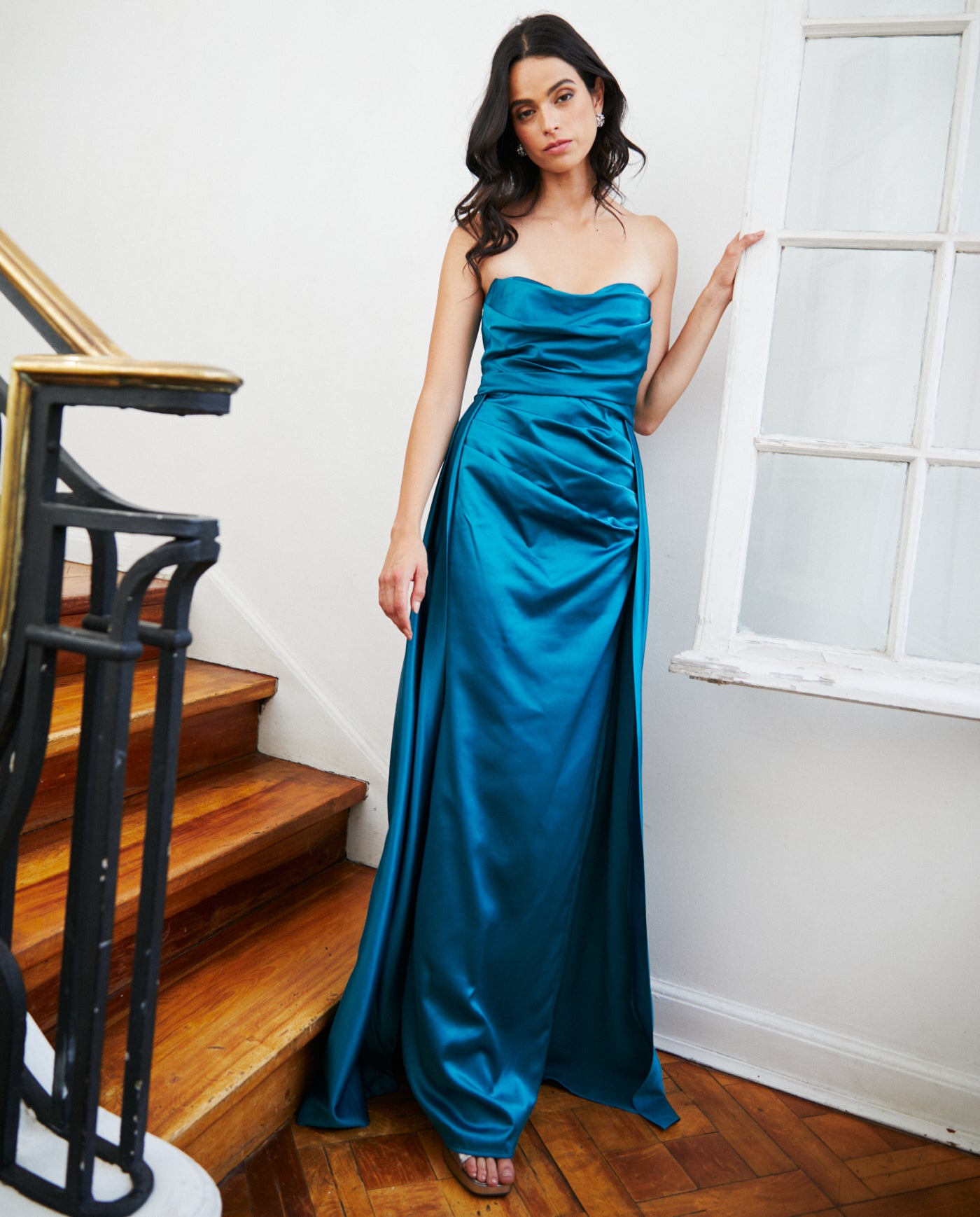 Vestido Largo de Fiesta Millaray Turquesa confeccionado en satín tela no elasticada, con drapeado en la cintura que realzan la silueta. Su diseño largo ofrece un look elegante y femenino, ideal para invitada matrimonio de noche, graduación, fiesta gala. Este vestido es parte de nuestra colección ee.uu.