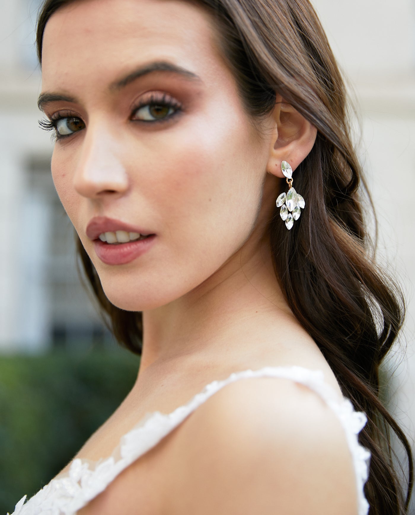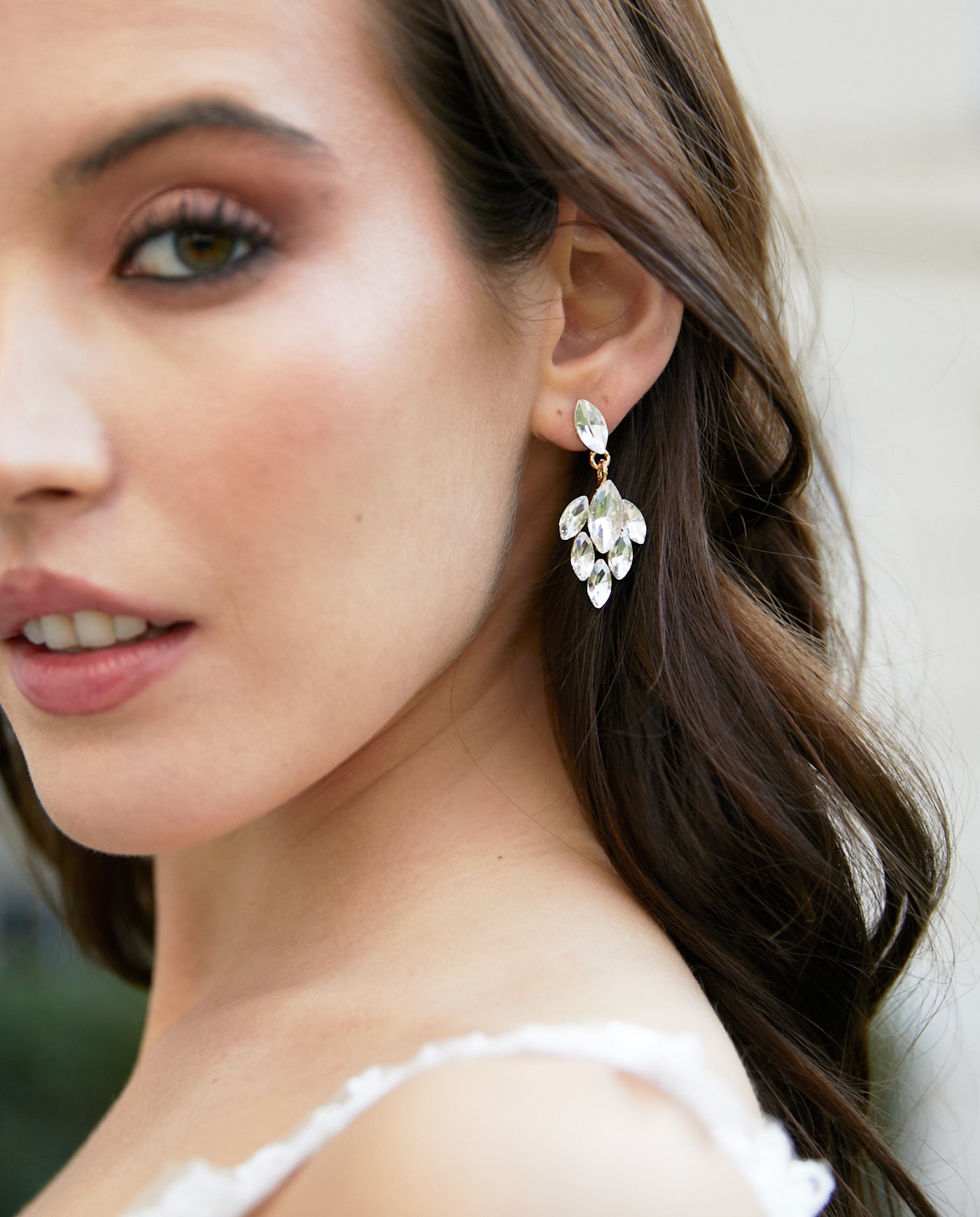 Estos aros tienen cristales transparentes en forma de gotas, con un diseño en cascada y base dorada. Son elegantes y brillantes, ideales para ocasiones formales.