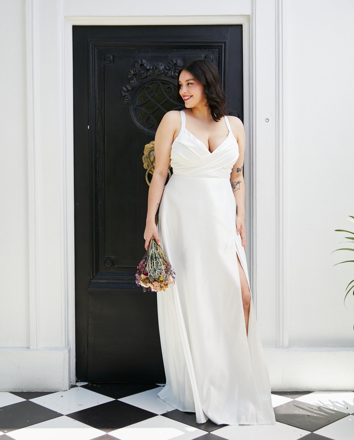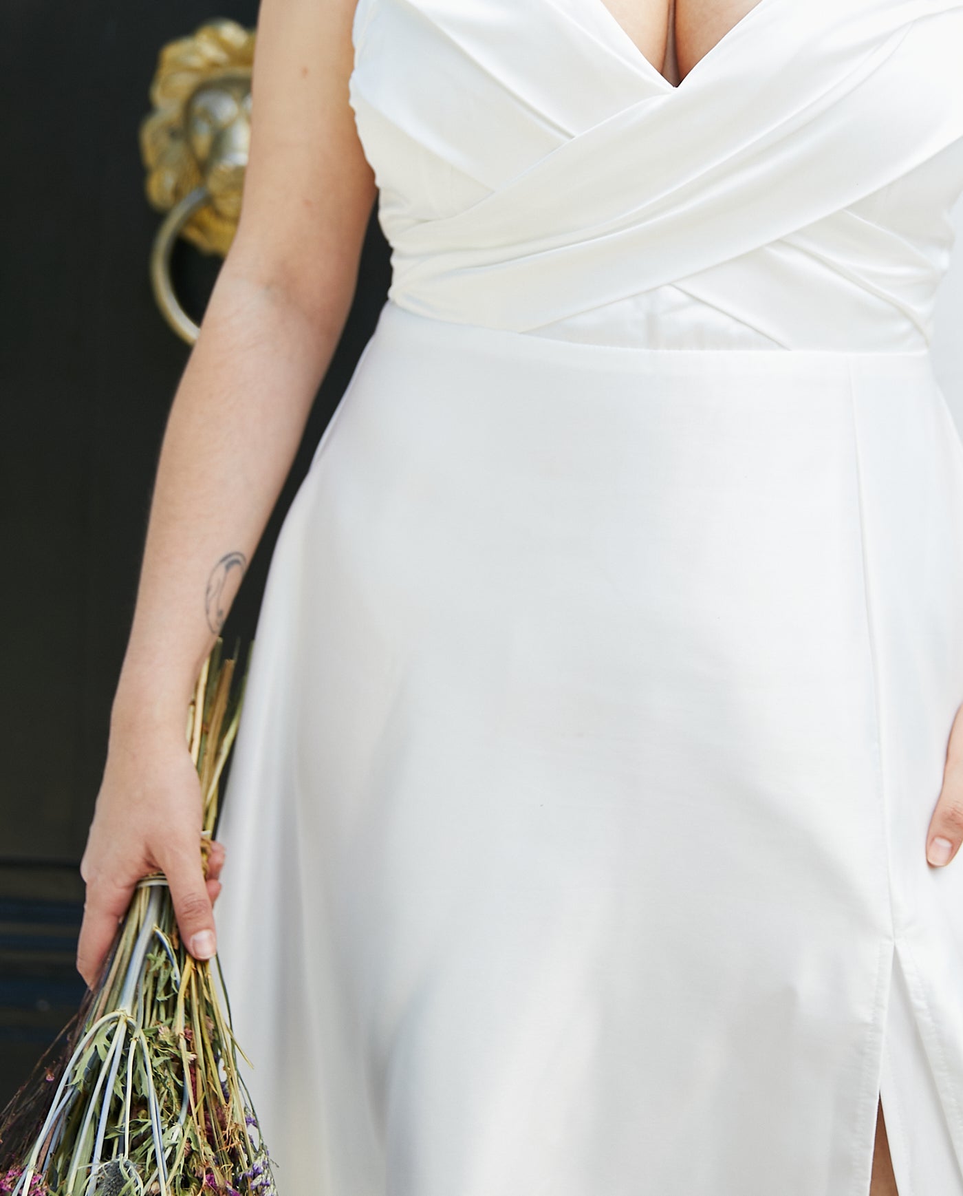 Vestido Largo de Novia Bea Ivory confeccionado en tela no elasticada, con abertura lateral que realzan la figura. Su diseño con un diseño equilibrado entre elegancia y comodidad lo convierte en una opción elegante para novias civil, novia segunda tenida, novia ceremonia. Este diseño es parte de nuestra COLECCIÓN PROPIA.