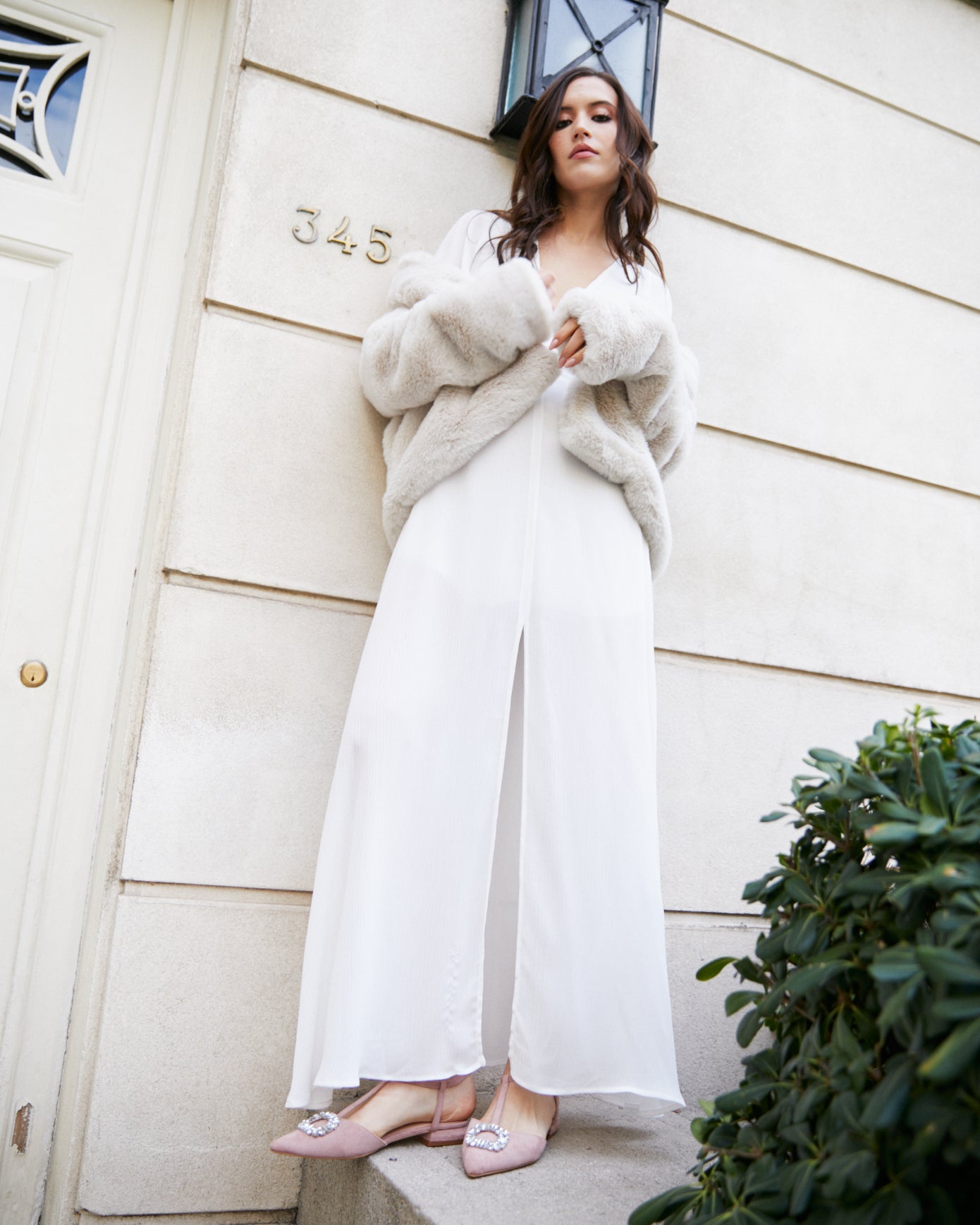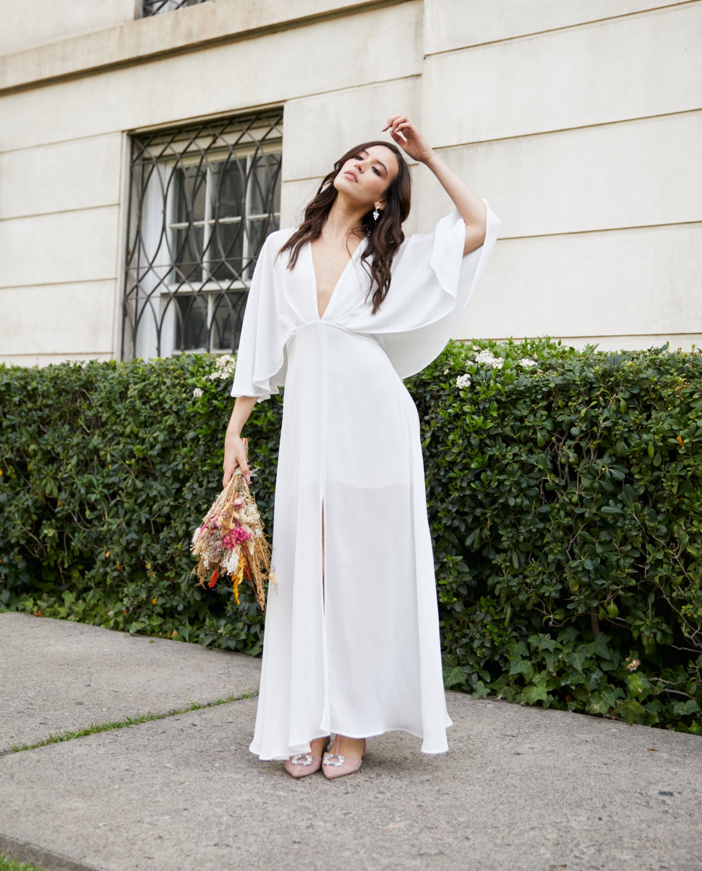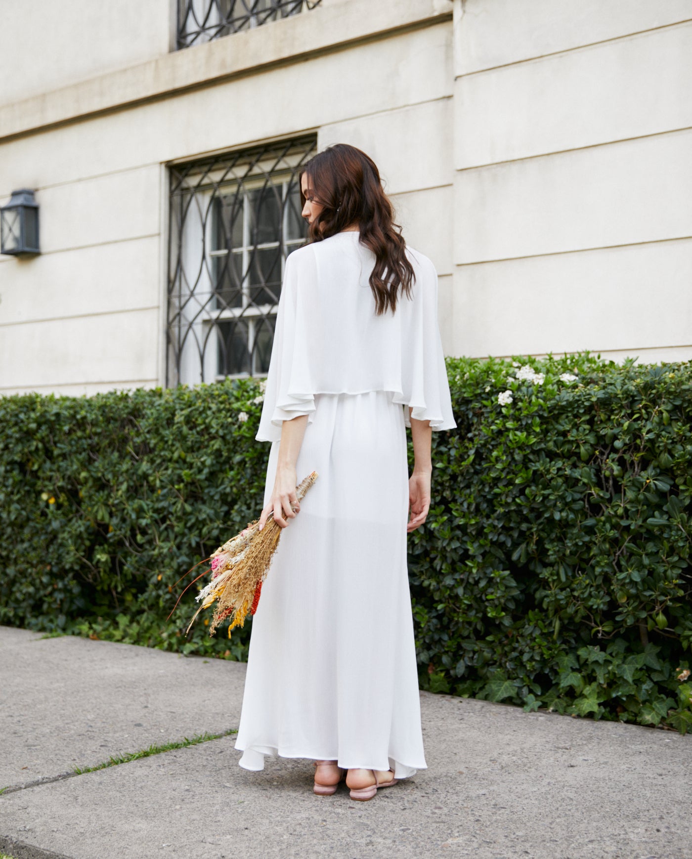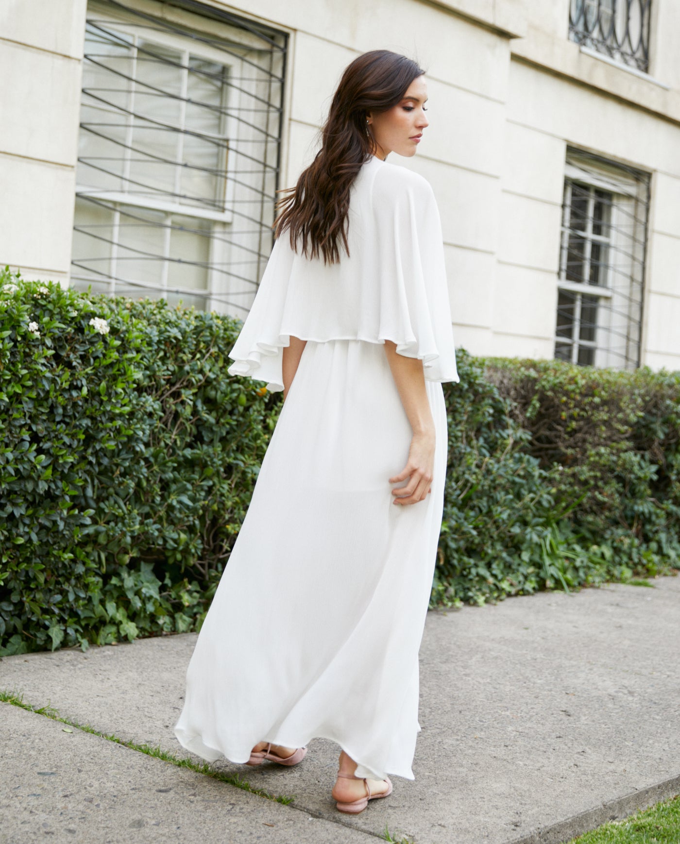 El Vestido Iris es un vestido largo confeccionado en USA en tela de gasa. Tiene un diseño suelto, con mangas estilo kimonos y capa que cubren los brazos. Posee un corte elástico en la cintura que permite que se adapte muy bien a las distintas tallas. Su falda cae sobre las caderas y tiene una abertura central que te permitirá moverte libremente y lucir las piernas lo que le da un efecto fluido y elegante, ideal para matrimonio civil o al aire libre.