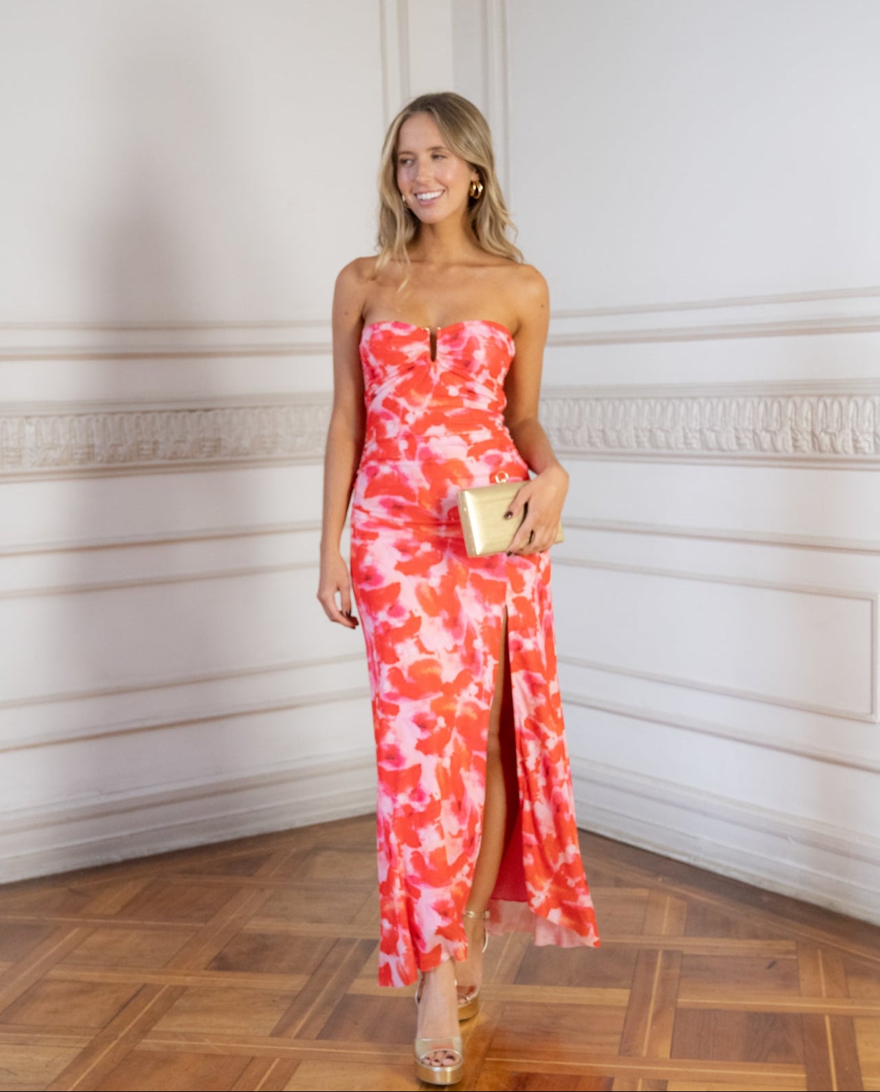 Vestido Largo de Fiesta Popi Estampado Fondo Rojo