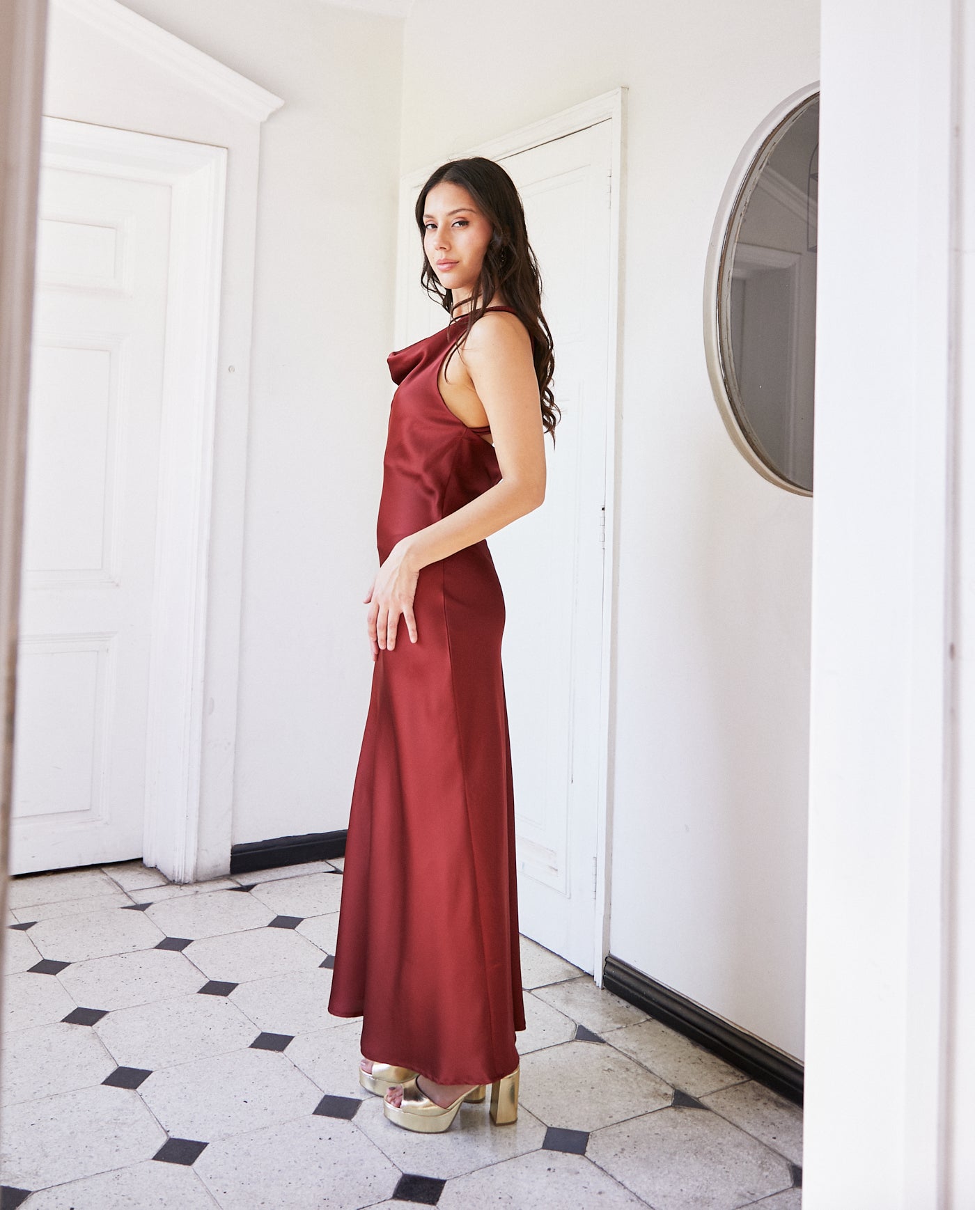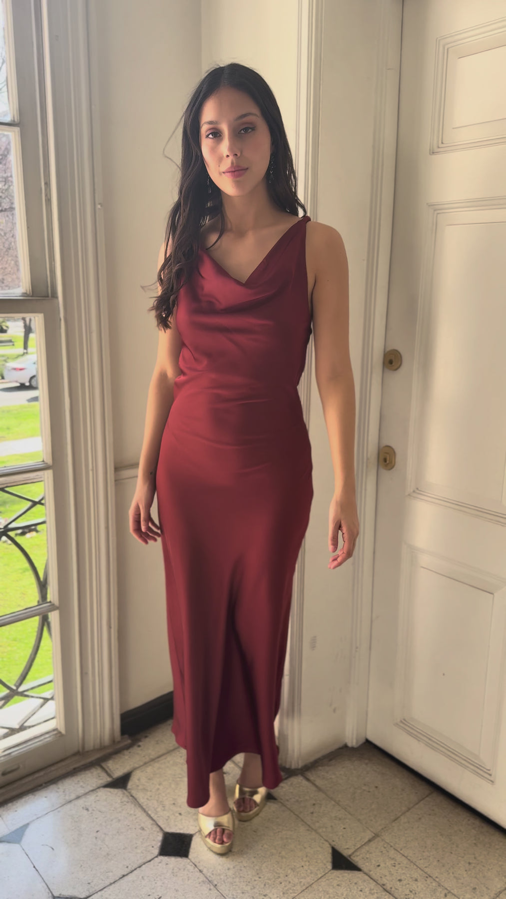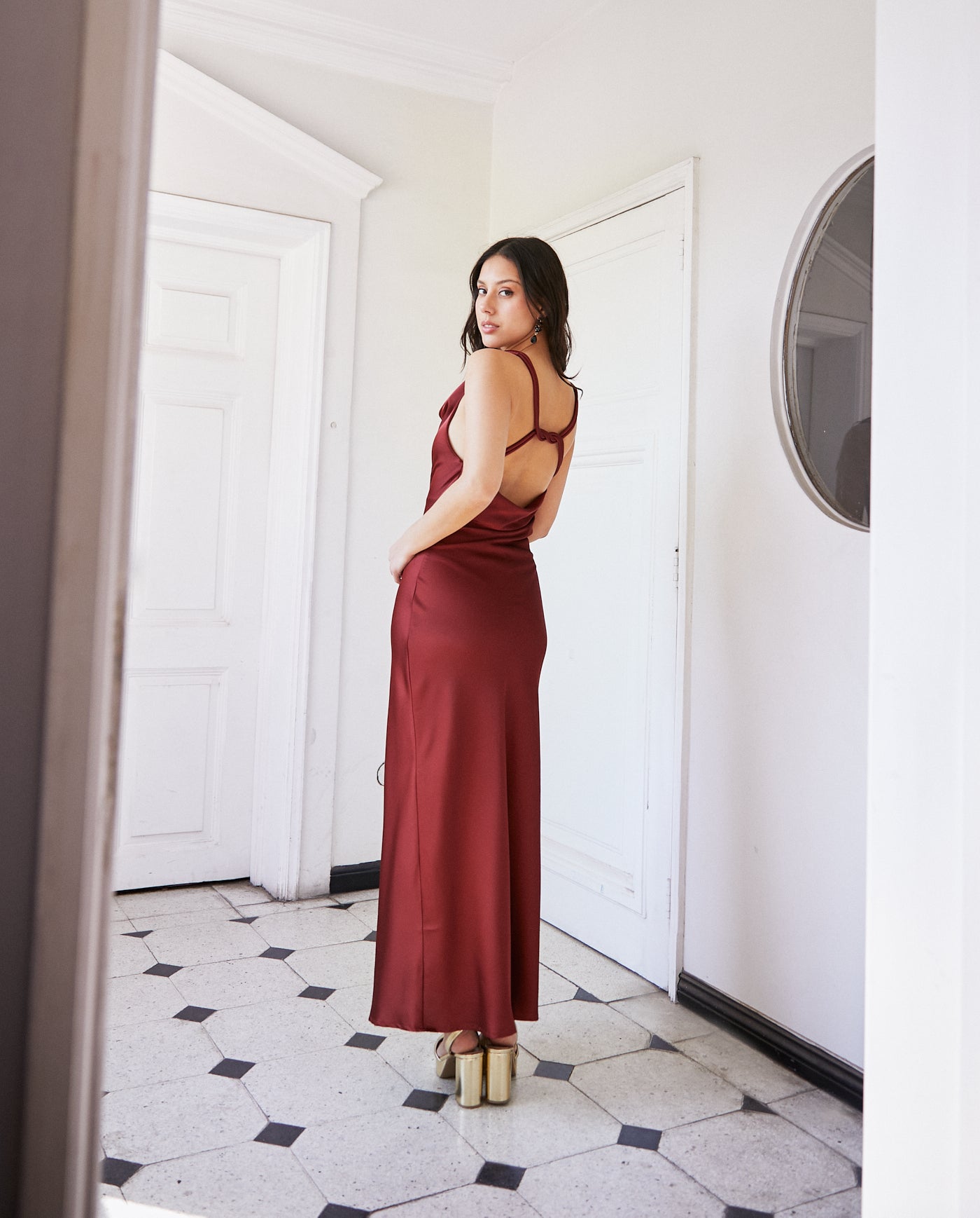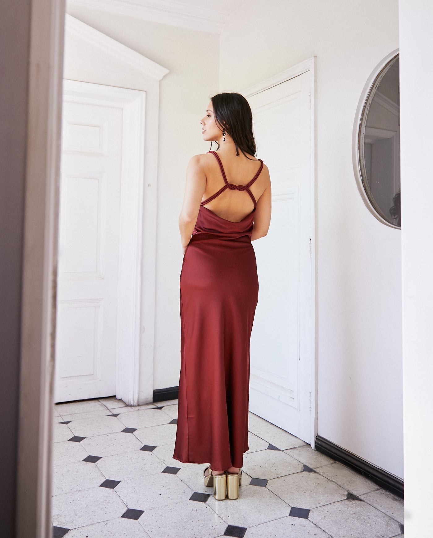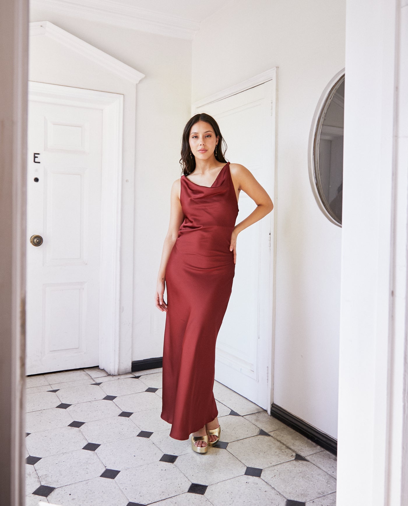 Confeccionado en satín no elasticado, el Vestido Montserrat Canela Oscuro destaca por su espalda rebajada y su caída recta que estiliza la silueta. Su diseño es perfecto para fiestas de gala y matrimonios de noche. Este vestido es parte de nuestra Colección EE.UU.