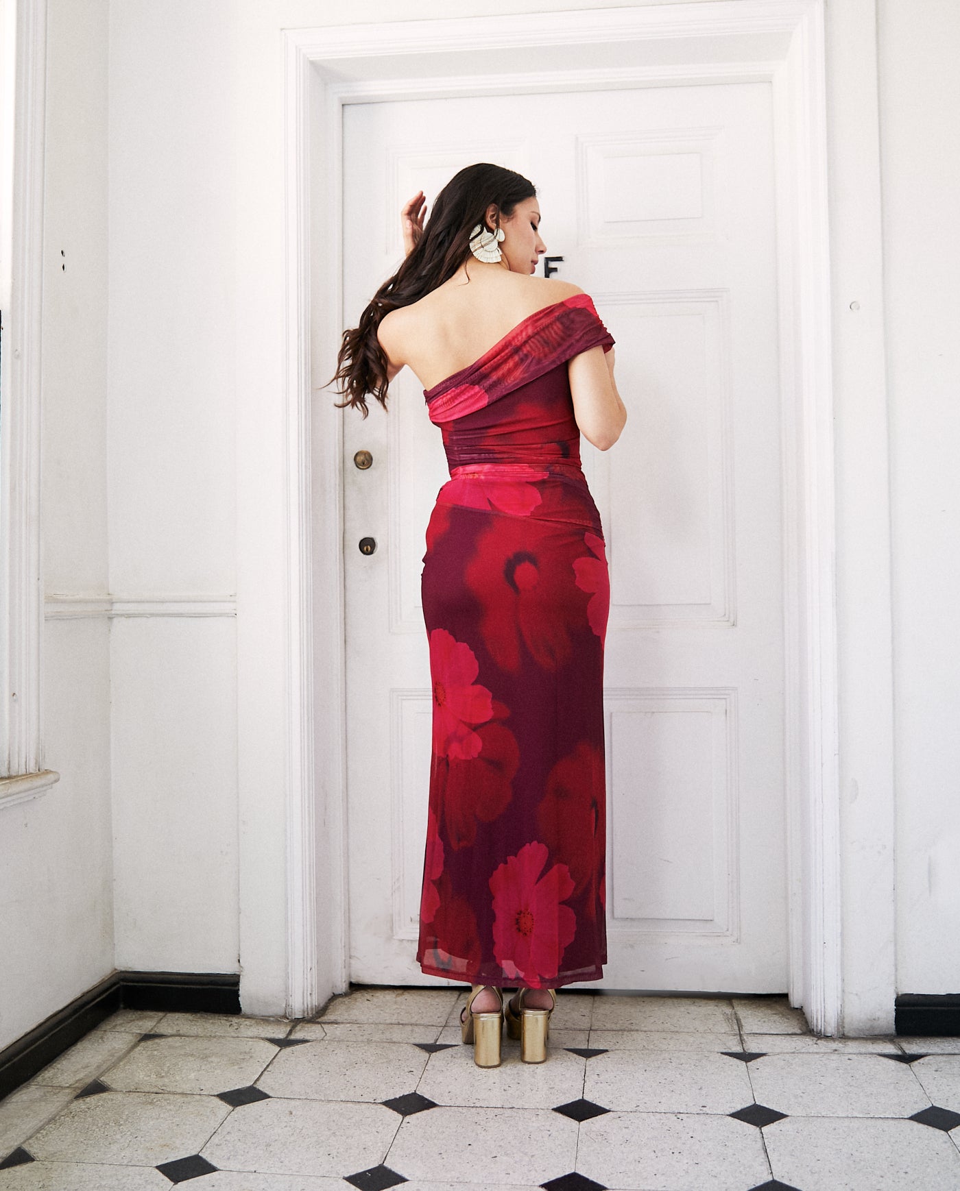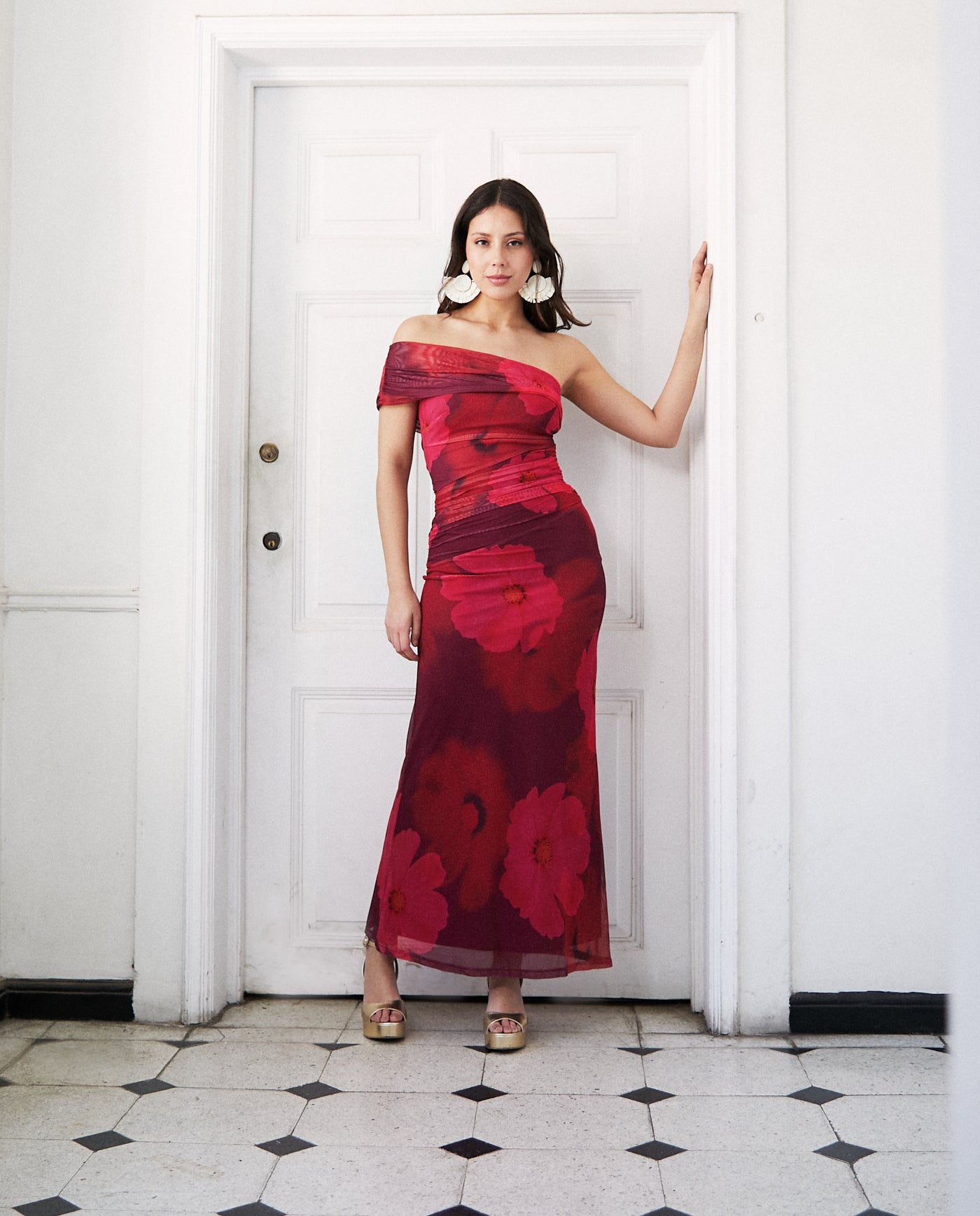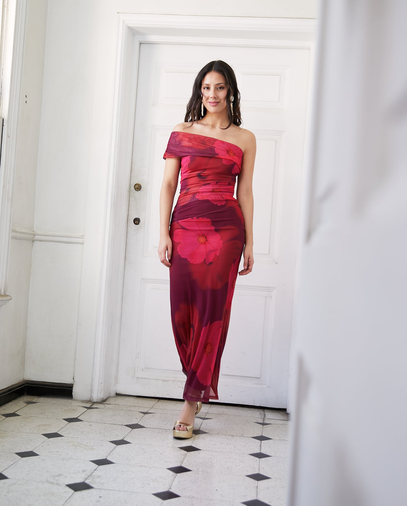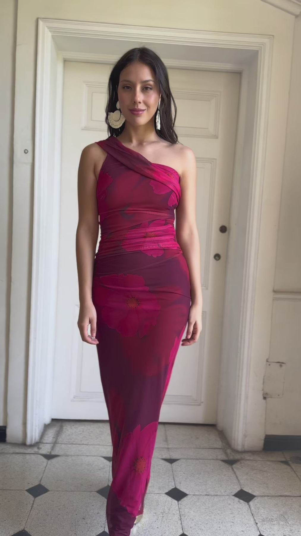 Este vestido de fiesta es elegante y sofisticado, con un diseño de una sola manga que aporta un toque moderno. El color burdeos resalta y es ideal para eventos formales como bodas, graduaciones o cenas elegantes. La tela es elasticada, ajustada en la parte superior, con detalles de fruncidos que definen la figura, mientras que la falda cae suavemente en línea recta, lo que da un efecto estilizado.