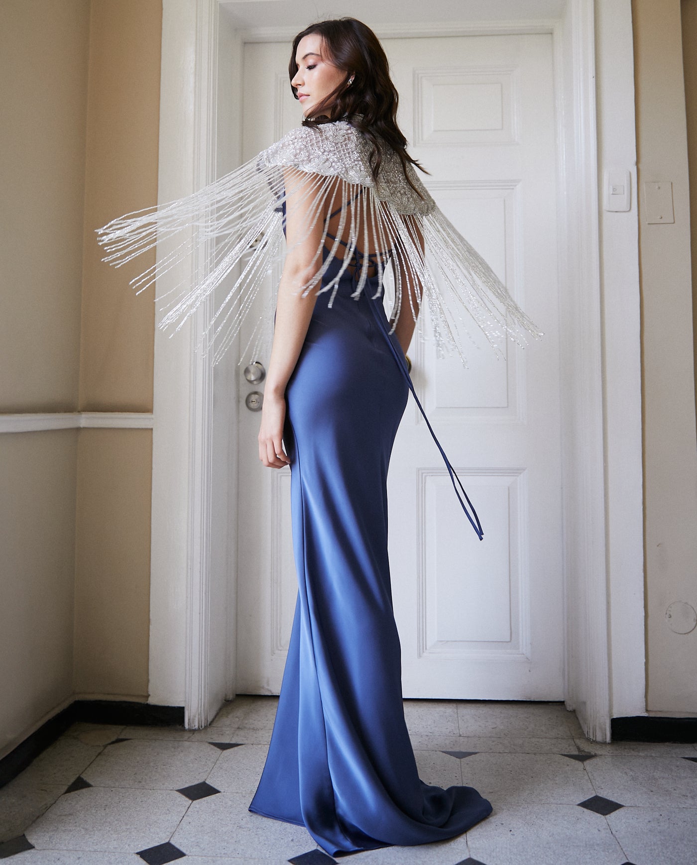 Capa Bordada de Mostacillas Indra Plateada/ Plateada