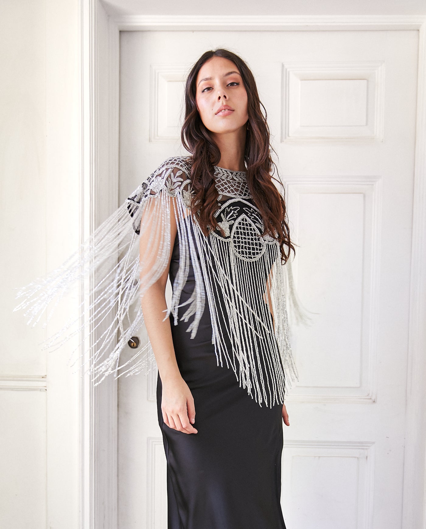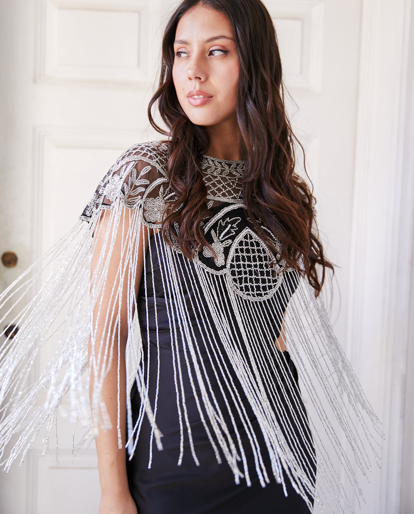 Capa de mostacillas, hecha 100% a mano por los mejores artesanos de la India. Esta capa o accesorio es ideal para complementar tu look de fiesta. Sus mostacillas y cuentas de cristal captan la luz desde cualquier ángulo. Con este complemento te sentirás única en ese momento especial.