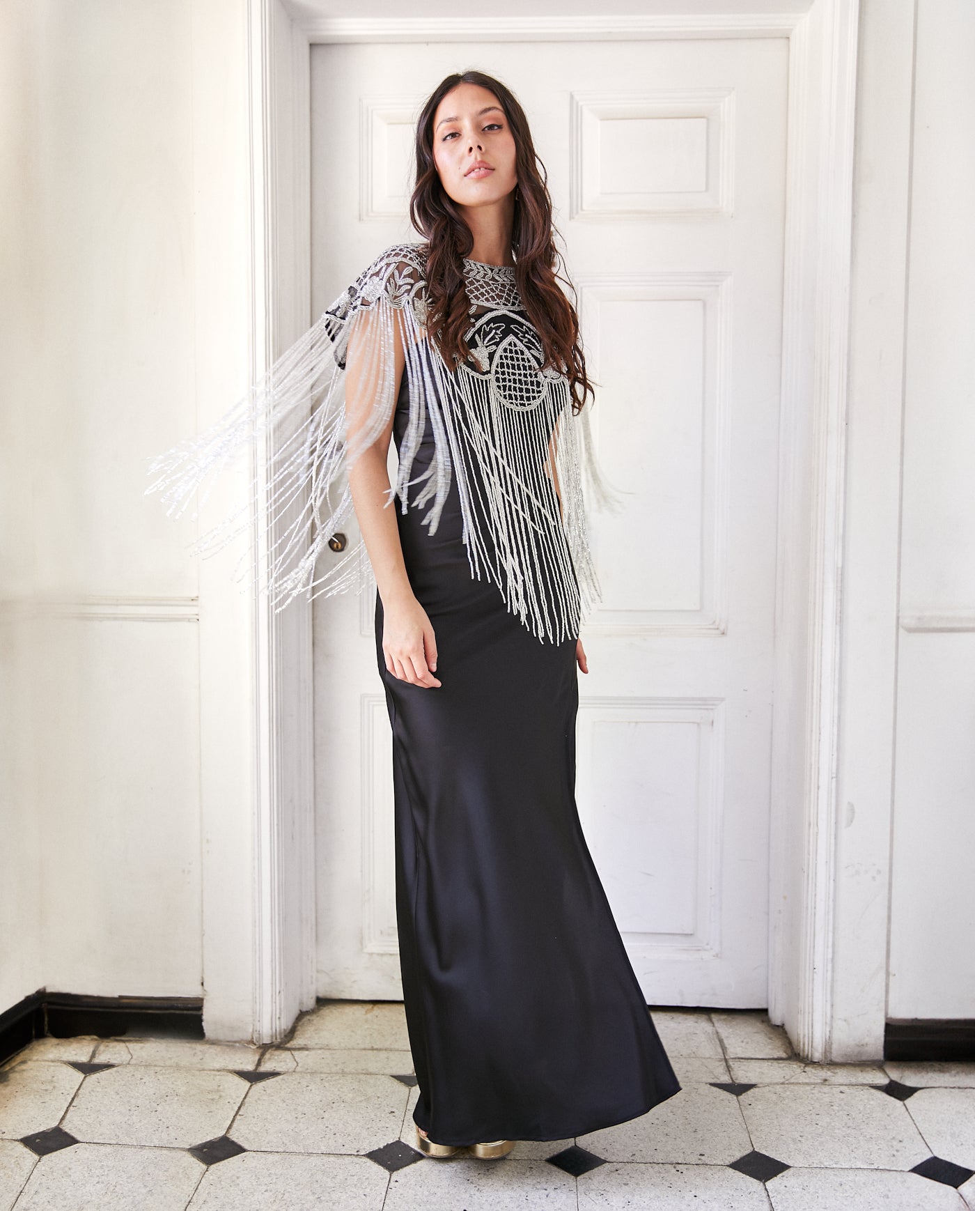 Capa Bordada Mostacillas Cerrada Ramana Plateado/Negro