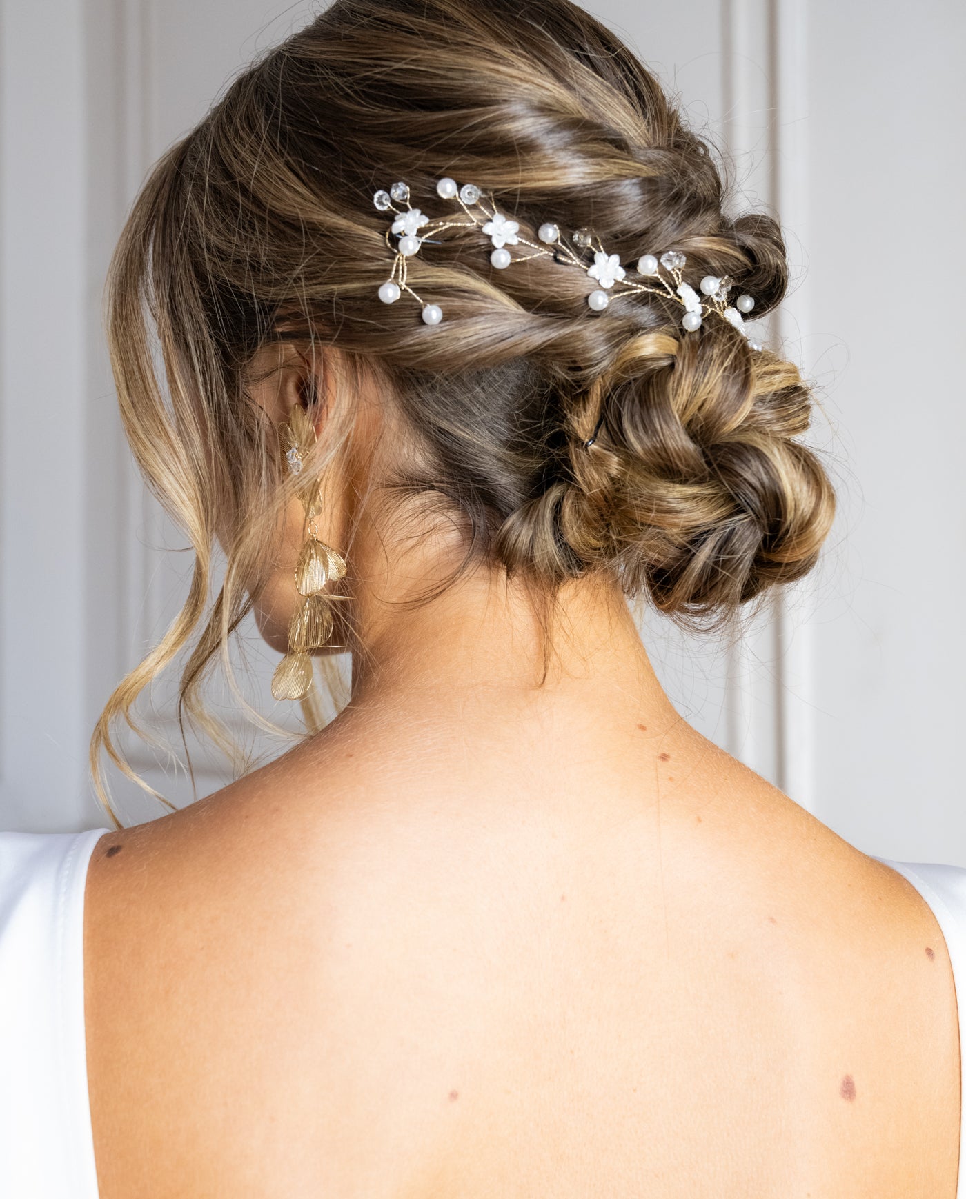 Tocado color dorado compuesto por pequeñas florecillas blancas y perlas de color blanco y transparentes. Se adaptan fácilmente al peinado que elijas para esta ocasión especial.
