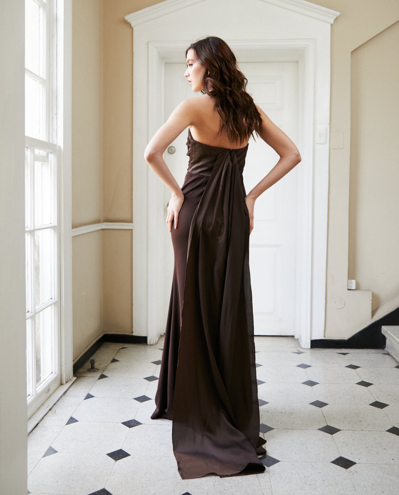 Este vestido de fiesta destaca por su elegancia y sofisticación, diseñado para realzar la silueta con un estilo atemporal. Confeccionado en un tono café profundo, su corte largo se ajusta suavemente al cuerpo hasta caer con fluidez al suelo.