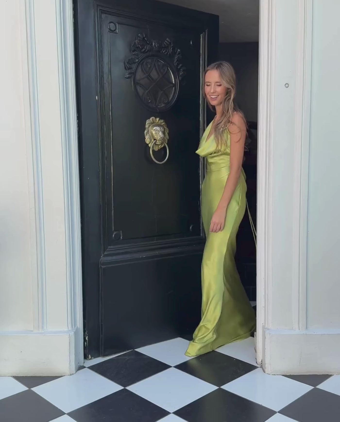 Vestido Largo de Fiesta Verde Verde Limón confeccionado en satín tela no elasticada, con vestido espalda rebajada que realzan la silueta. Su diseño largo ofrece un look elegante y femenino, ideal para invitada matrimonio de noche, graduación, fiesta gala. Este vestido es parte de nuestra colección ee.uu.