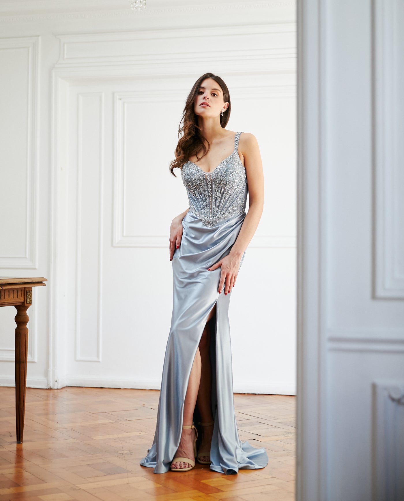 Vestido Largo de Fiesta Madrid Celeste confeccionado en tela elasticada, con abertura lateral que realzan la figura. Su diseño de falda larga y caída fluida lo convierte en una opción elegante para invitada matrimonio de noche, graduación, fiesta empresa, fiesta gala. Este diseño es parte de nuestra Colección EE.UU.
