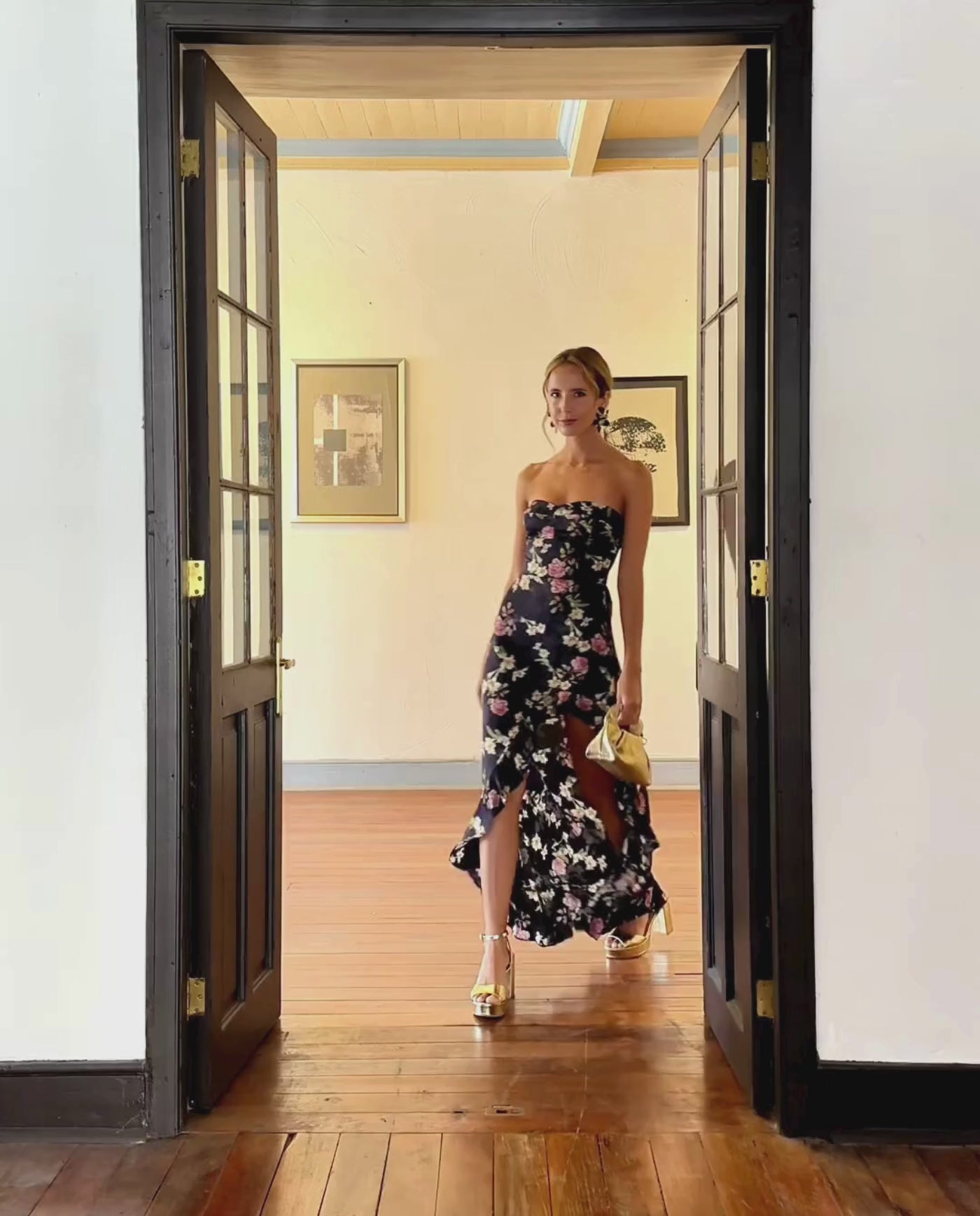 Vestido Largo de Fiesta Azucena Fondo Negro confeccionado en Satín, con ABERTURA LATERAL, VUELOS que realzan la silueta de forma elegante. Su diseño de líneas limpias y caída fluida ofrece un look femenino y sofisticado, ideal para Invitada matrimonio de día, Invitada matrimonio de noche, Fiesta empresa, Titulación. Este vestido es parte de nuestra Colección EE.UU.