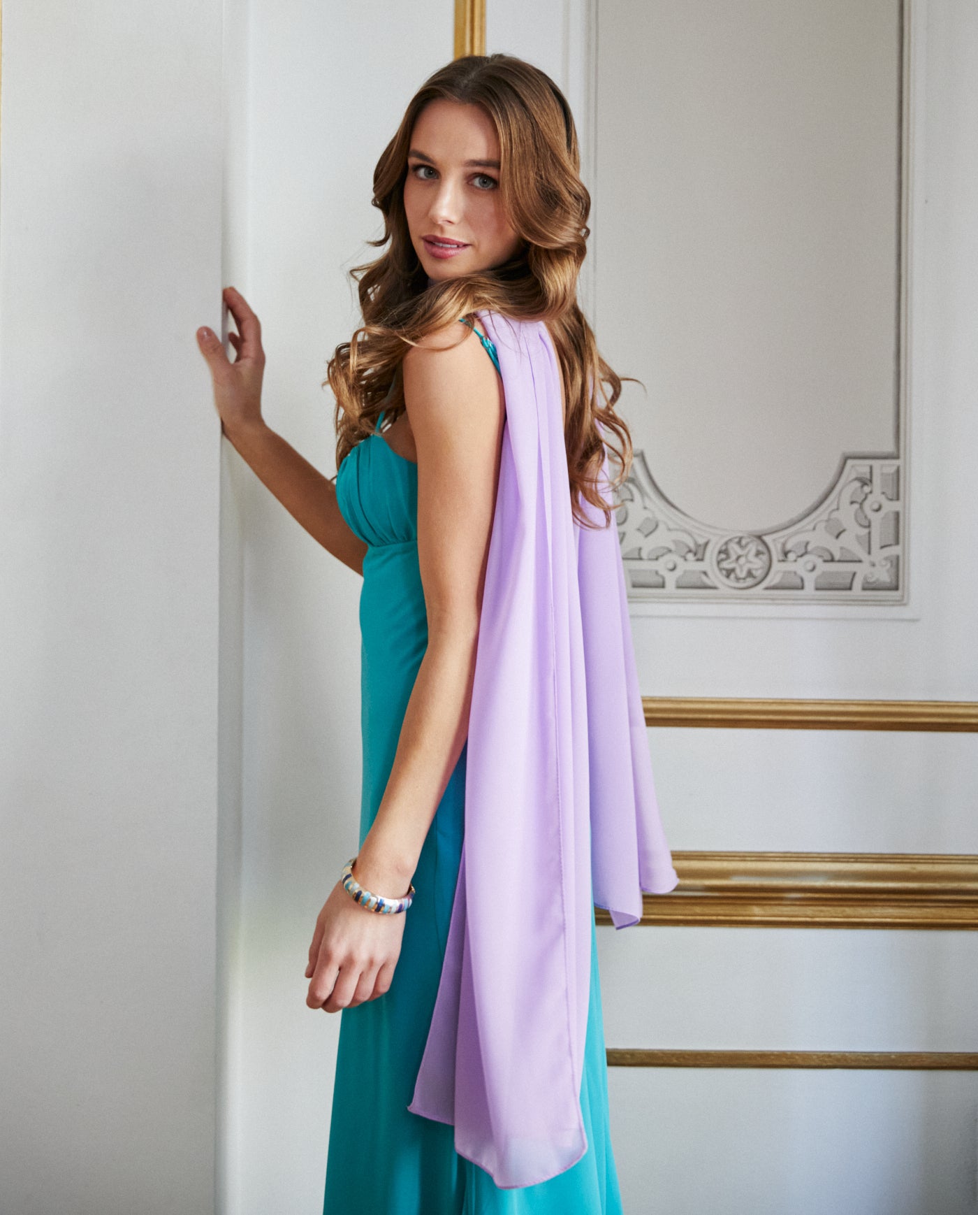 Nuestro Maxi Pañuelo Antonia Gasa es ideal para complementar vestidos de fiesta, looks de invitada, graduaciones y matrimonios. Su tamaño extra largo permite usarlo como capa, chal, echarpe o sobre los hombros, creando distintas formas según el estilo de tu vestido.