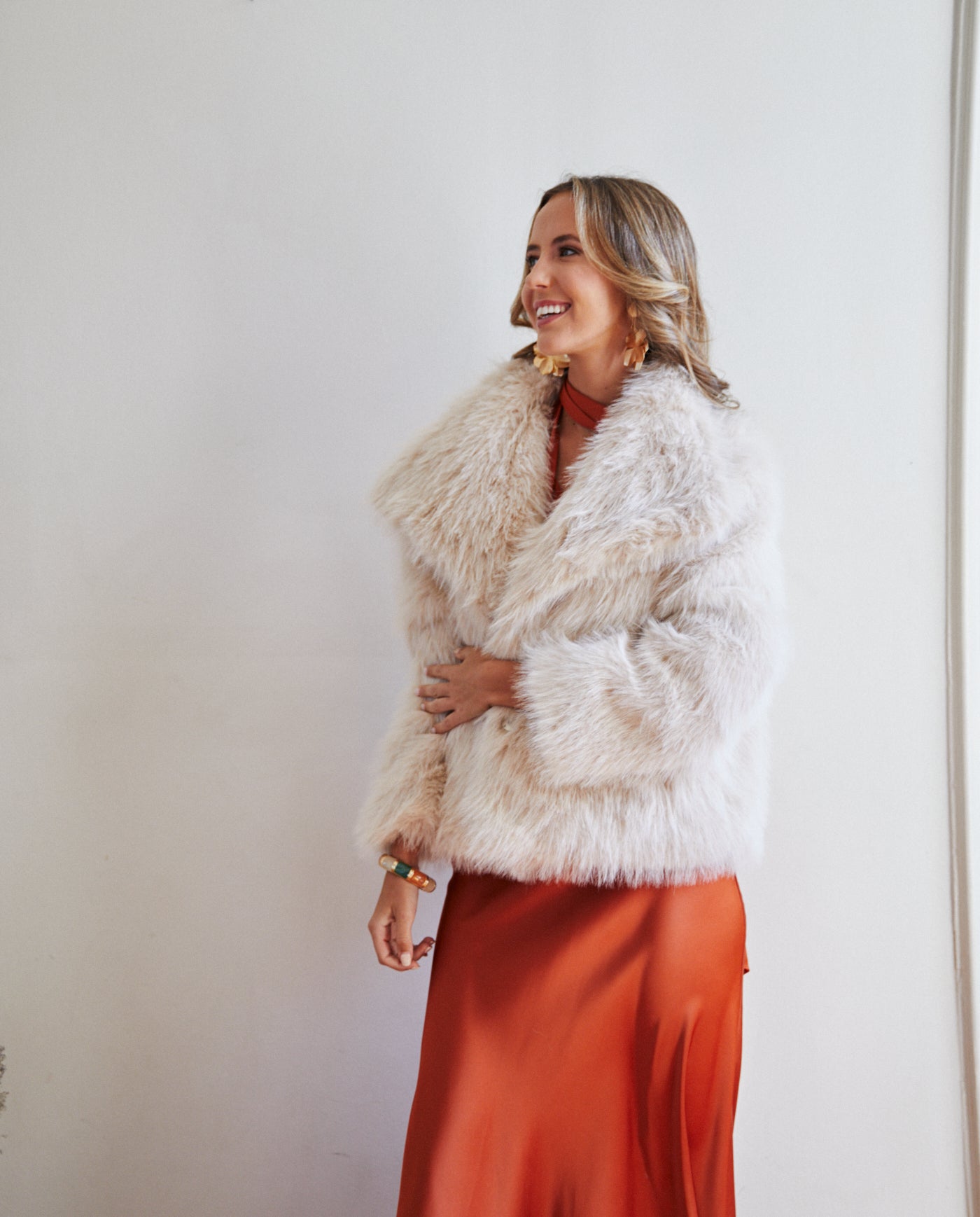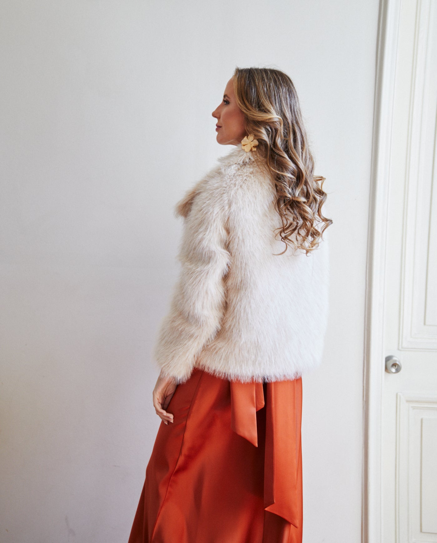 Peludo Lucia Beige es un chaqueta confeccionado en tela textura tipo piel en tono beige. Un accesorio versátil y elegante, ideal para complementar vestidos de fiesta y de novia, aportando estilo y calidez a tu look en cualquier evento especial.