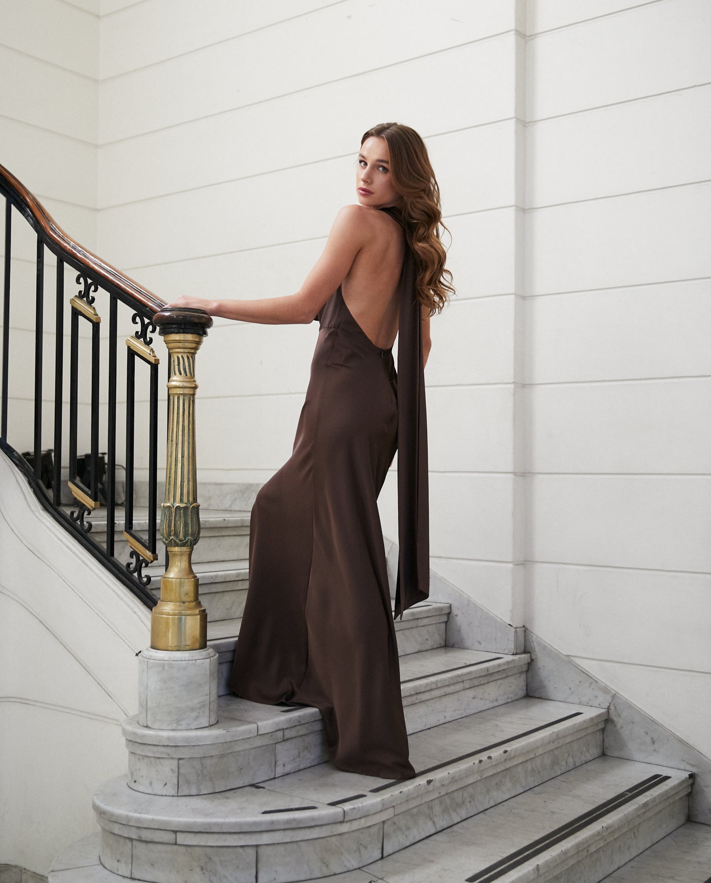 Vestido Largo de Fiesta Budapest chocolate confeccionado en no elasticada, con vestido espalda rebajada, gargantilla/lazo que realzan la figura. Su diseño de falda larga y caída fluida lo convierte en una opción elegante para invitada matrimonio de noche, graduación, fiesta empresa, fiesta gala. Este diseño es parte de nuestra Colección EE.UU.