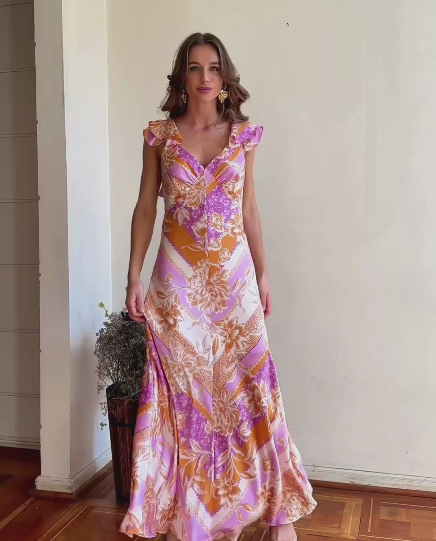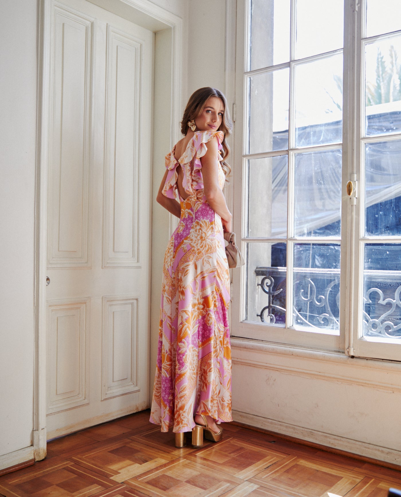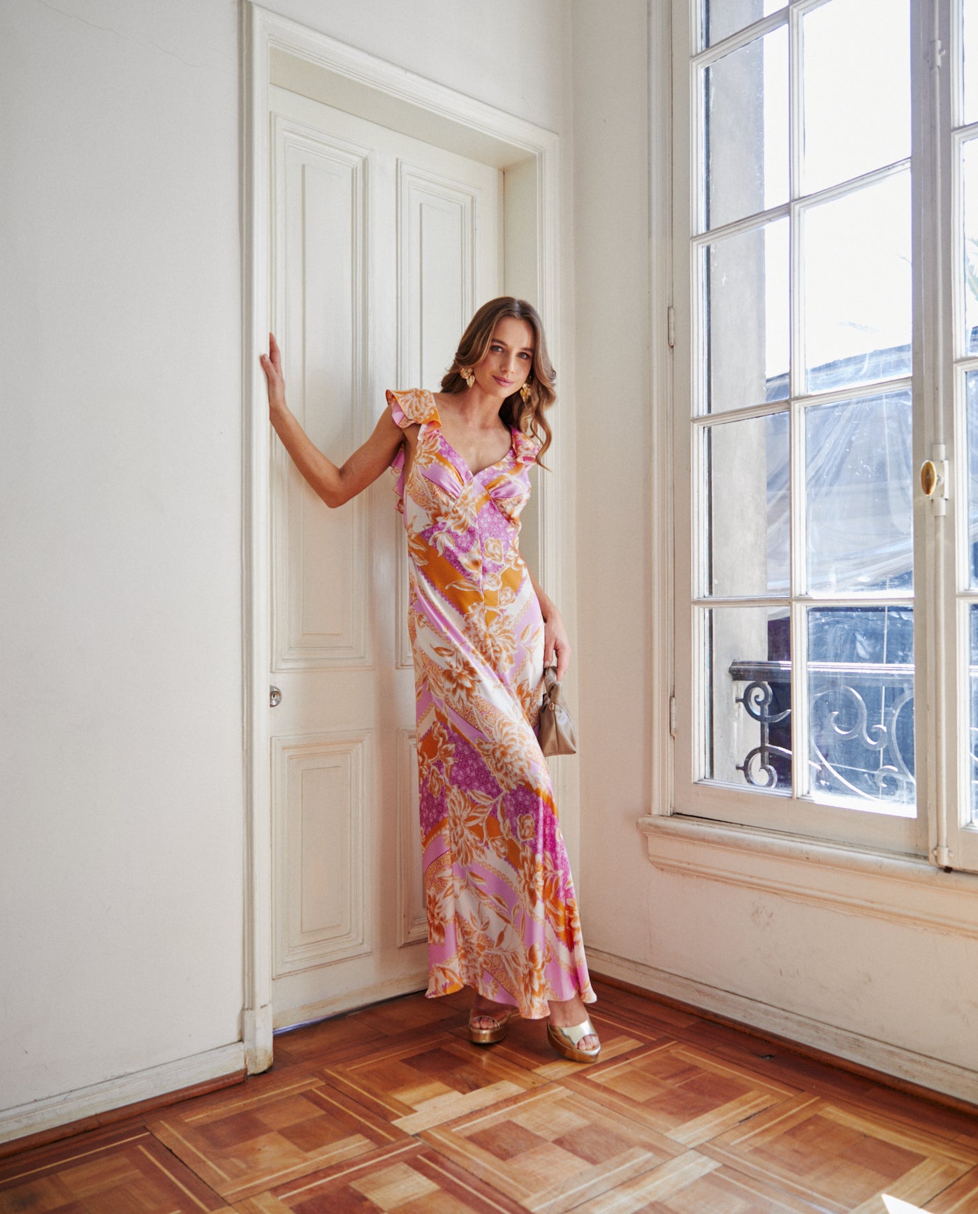 Vestido Largo de Fiesta Canela Fondo Rosado confeccionado en Satín rosado, con vuelos mangas que realzan la figura de forma natural. Su diseño largo ofrece un look elegante ideal para invitada matrimonio de día, titulación. Este vestido es parte de nuestra Colección AUSTRALIA.