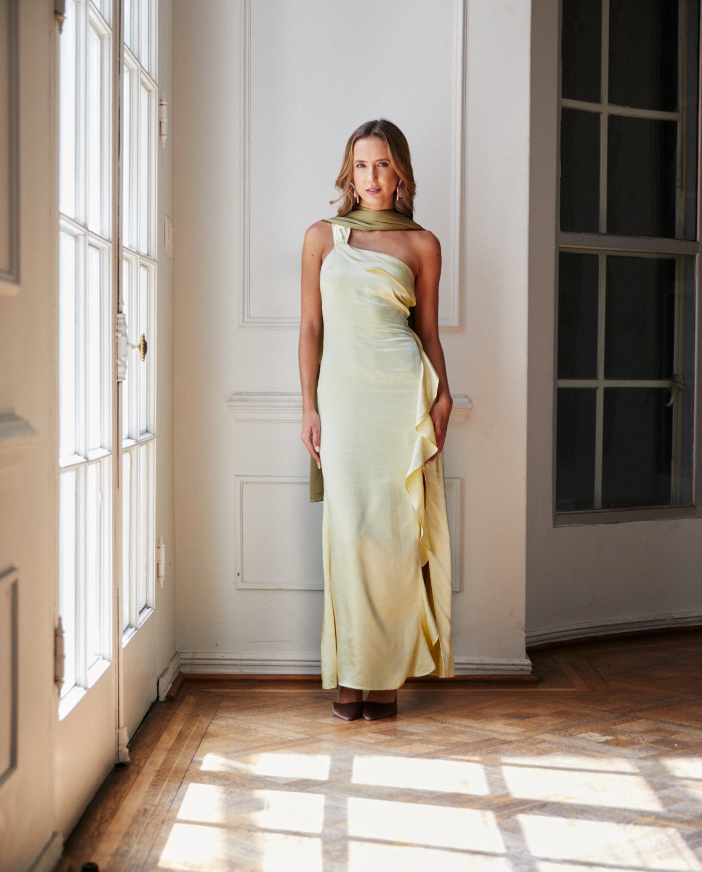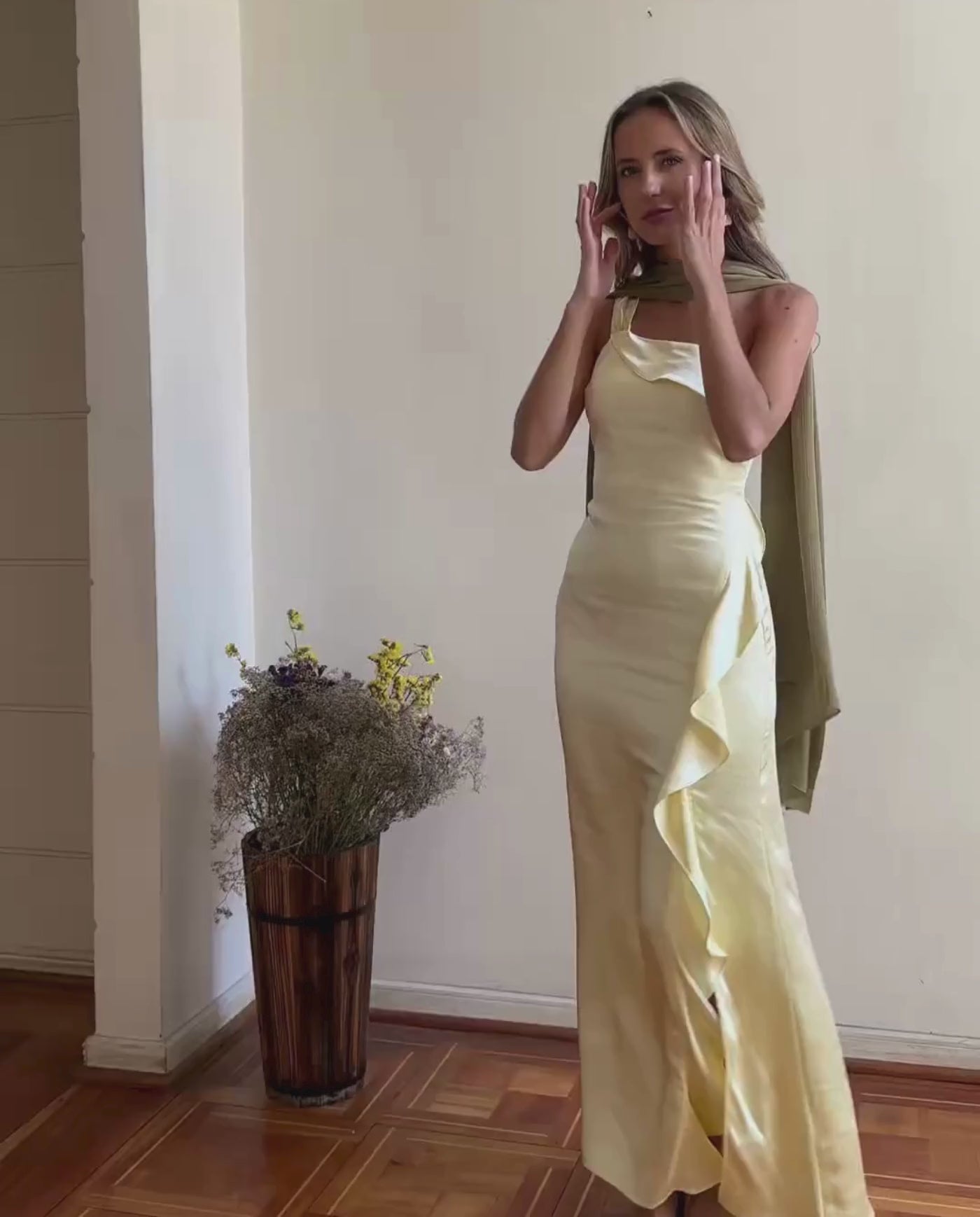 Vestido Largo de Fiesta Soledad Amarillo confeccionado en Satín, con abertura lateral, choker/lazo, vuelos faldon que realzan la figura de forma natural. Su diseño largo ofrece un look elegante ideal para invitada matrimonio de día, invitada matrimonio de noche, graduación, fiesta gala. Este vestido es parte de nuestra Colección AUSTRALIA.