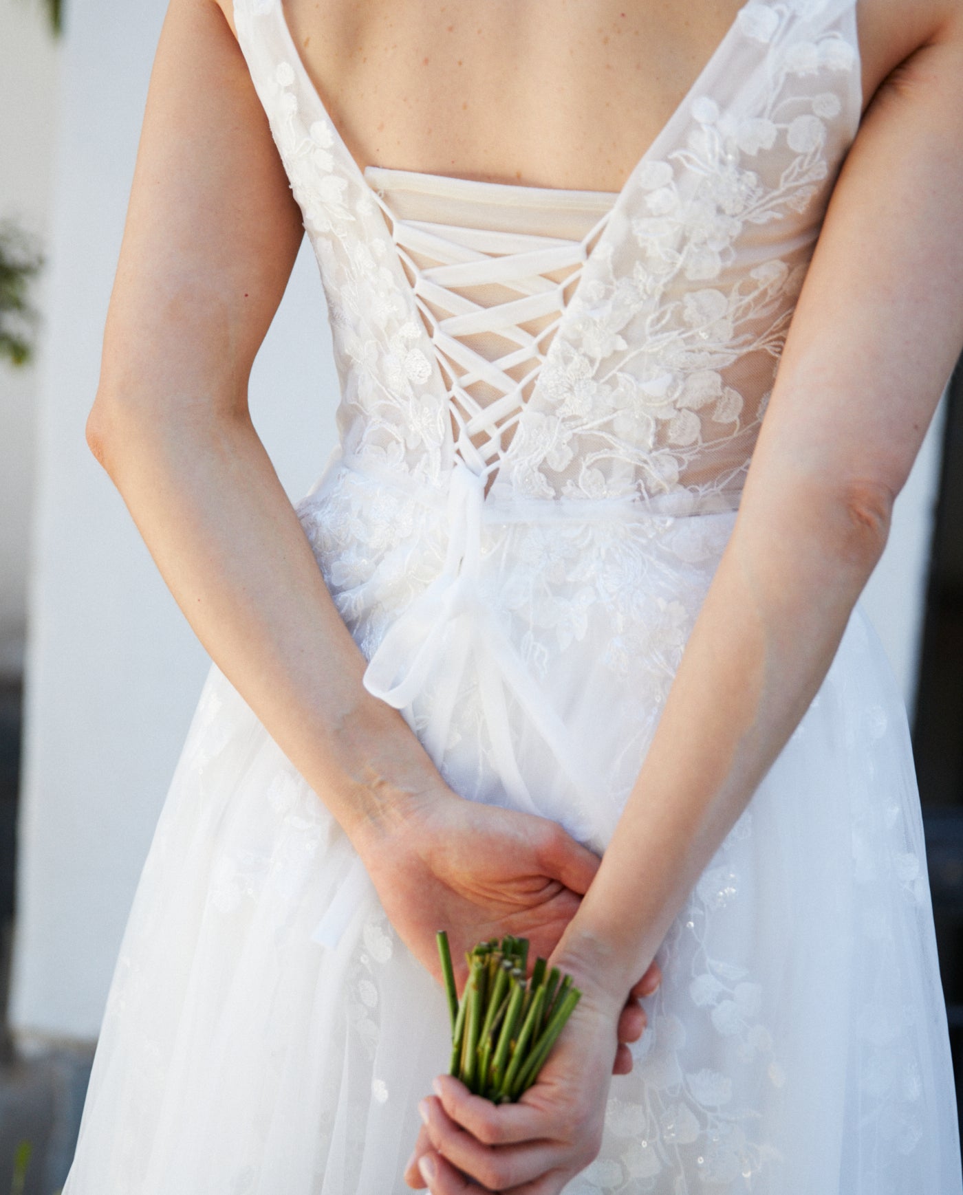 Confeccionado en tul color ivory, Eloise incorpora una cola posterior y una espalda con delicados lazos ajustables, que permiten adaptarlo con precisión a cada silueta y realzan el diseño con elegancia. Además, incluye una fina aplicación de tul integrada en uno de sus laterales, que envuelve la espalda con sutileza. Esta pieza puede extenderse para lograr un acabado más clásico o recogerse suavemente, dejando la espalda más descubierta y transformando el look en una versión más liviana y moderna.